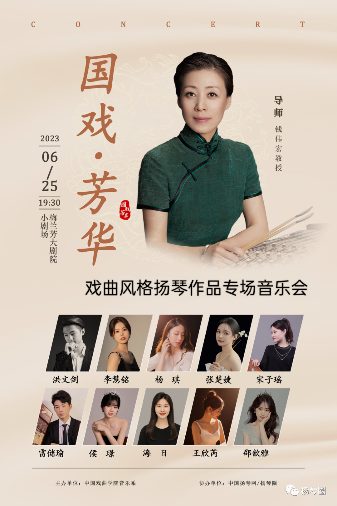 本场音乐会的一大亮点为所演曲目均包含戏曲元素,由导师钱伟宏教授带领国戏·芳华成员共同完成。曲目包含独奏、合奏、重奏的形式,不仅包含经典曲目《夜深沉》,也有2022年新创作的新作品《风有约·花不误》、扬琴二重奏交响曲《红色娘子军》;有秦腔音乐《秦韵》,也有京剧风格扬琴曲《迎春》;以山西冀城花鼓为素材创作的《花鼓敲起来》,现代京剧样板戏《打虎上山》,还有京剧风格扬琴曲《京韵风》。扬琴与戏曲碰撞的火花,彰显国粹的力量,就在25日晚,期待与您相见。