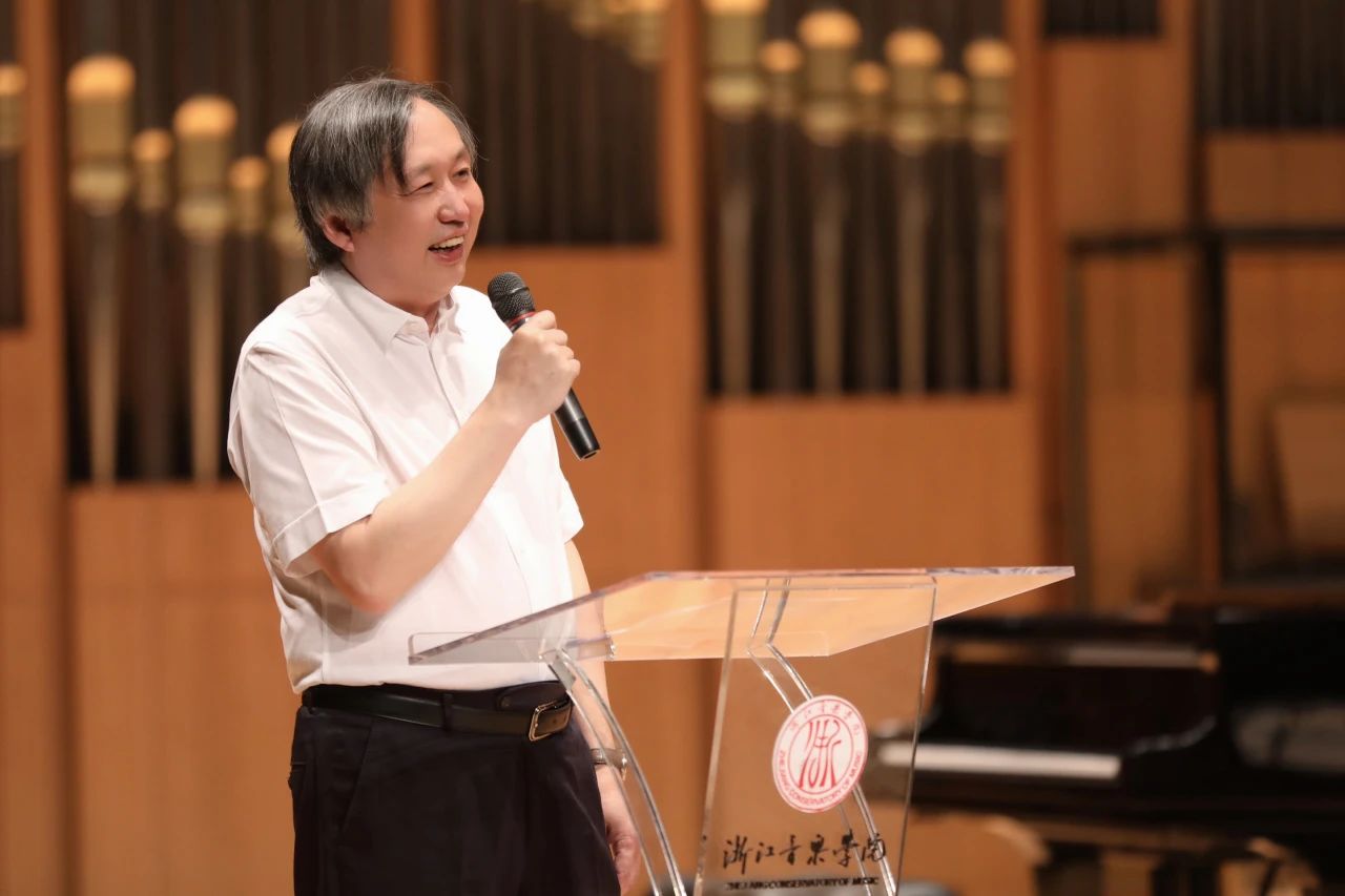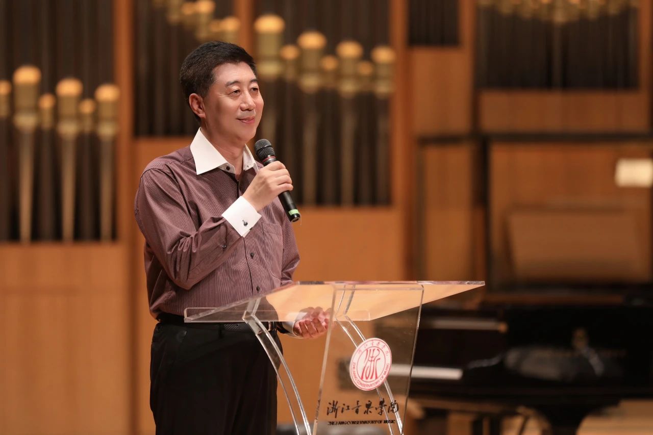 中国民族管弦乐学会扬琴专业委员会常务副会长兼秘书长、中央民族大学教授许学东老师致辞:“从第一届2012年第一届中国扬琴艺术节在杭州这个地方举办,我是策划人和组织者,当时杭州的老师还不是很多,时隔11年之后,甚至经历了三年的疫情,我们在第四届扬琴艺术节看到了浙江扬琴的队伍在逐渐的壮大,那么多的孩子在杭州这个地方生根,落叶开花,我感觉这是浙江的扬琴同仁们共同的努力,才有了今天这么丰硕的成果;有了这么大的一个在浙江扬琴队伍。我们都知道原来说是湖南是扬琴大省,我今天可以非常自豪的跟你们说了,杭州甚至浙江也是中国的扬琴大省。我们浙江的扬琴同仁们,老师们孜孜不倦的努力,一直奋斗拼搏,在默默的做着很多的基础教学的工作,所以我这次可接触到了不同阶段的扬琴学生,从兴趣爱好者,到职业学校学生,再到音乐学院学生,甚至到研究生。我感觉到了十年时间,你们的演奏水准是在逐步的提高,甚至是突飞猛进的在提高,那么我也祝愿浙江扬琴艺术节会作为中国扬琴界的其中一个非常靓丽的品牌,一直风光的办下去!"