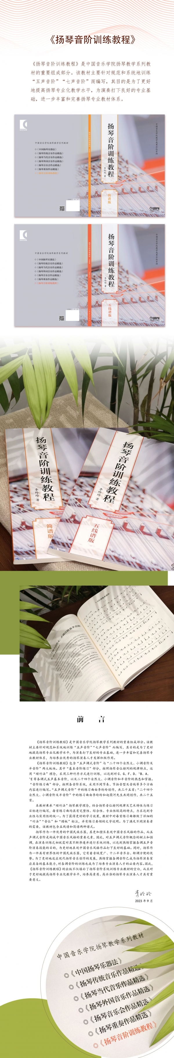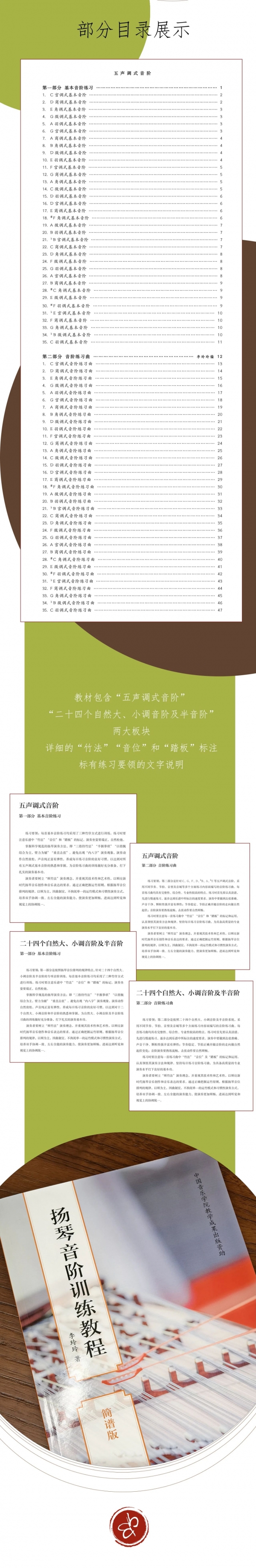 《扬琴音阶训练教程》是中国音乐学院扬琴教学系列教材的重要组成部分。该教材主要针对规范和系统地训练“五声音阶”“七声音阶”而编写,其目的是为了更好地提高扬琴专业化教学水平,为演奏打下良好的专业基础,进一步丰富和完善扬琴专业教材体系。