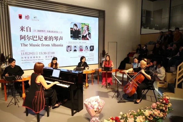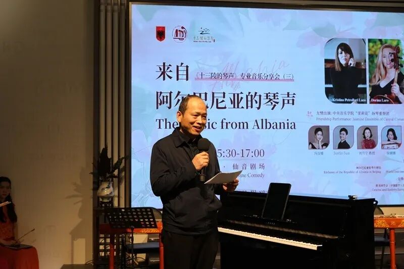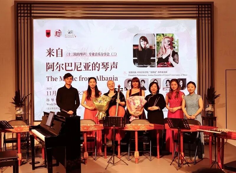 初冬的北京,光秃秃的柳枝在风中摇曳,映着初雪即将到来的灰色,有一点小小的冷冽。可是在昌平区十三陵镇仙人洞村的扬琴博物馆仙音剧场里却人头攒动,正值阿尔巴尼亚76周年国庆之际,《十三陵的琴声》专业音乐分享会第三场“来自阿尔巴尼亚的琴声”于2025年11月29日下午温情上演。