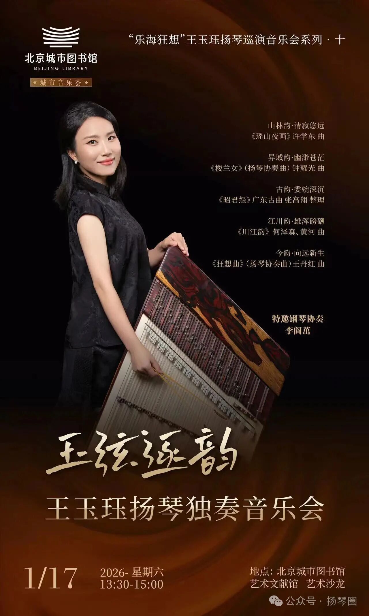 弦承百年韵,琴鸣赤子心。扬琴自传入华夏,经数百年薪火相传,早已褪去异域痕迹,化作承载东方审美、传递民族精神的文化载体。琴竹击弦的独特韵律,既藏着华夏文明的温润,也透着兼容并蓄的开阔。本场音乐会中,王玉珏精选五首风格迥异的艺术臻品,循“初心-拓界-传承-扎根-未来”之序,以《瑶山夜画》清寂立初心,《楼兰女》幽渺拓新界,《昭君怨》深沉承传统,《川江韵》雄浑扎深根,《狂想曲》灵动赴未来。这既是对扬琴艺术东方成就的致敬,更是对百年文脉传承的坚守。诚邀读者参与,于琴竹击弦的韵律中,溯古今韵律之变,感民族艺术之醇,赏中国扬琴之东方雅韵。