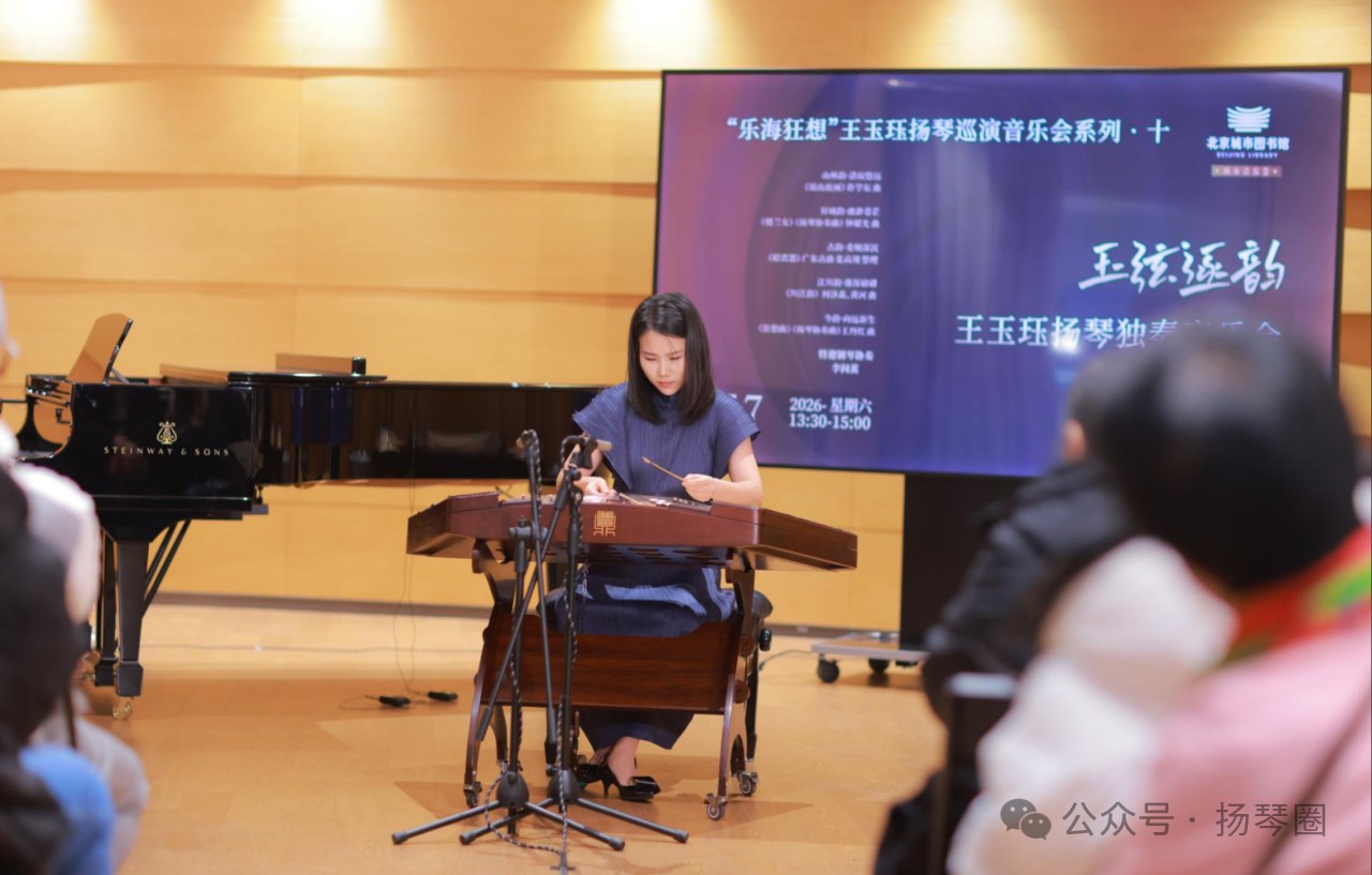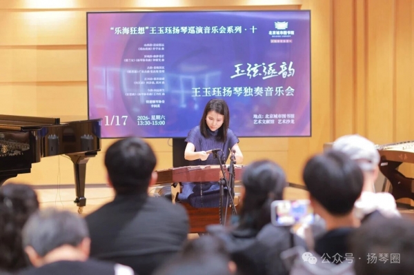 2026年1月17日,“乐海狂想”·王玉珏扬琴巡演系列音乐会·十——玉弦逐韵·王玉珏扬琴独奏音乐会在北京城市图书馆艺术文献馆圆满落幕。青年扬琴演奏家王玉珏演绎五首风格迥异的经典之作,音乐会以“初心-拓界-传承-扎根-未来”为序,特邀李阎茁担任钢琴协奏,为现场观众献上一场兼具东方雅韵与时代活力的民族音乐盛宴。出席此次音乐会的嘉宾有著名扬琴演奏家、教育家、中央音乐学院博士生导师黄河教授;中央民族大学博士生导师许学东教授;中央民族大学音乐学院博士生导师张朝教授;中国戏曲学院钱伟宏教授;中国戏曲学院李瑾副教授;中国音乐学院罗媛老师;华中科技大学艺术学院陈妍君老师。