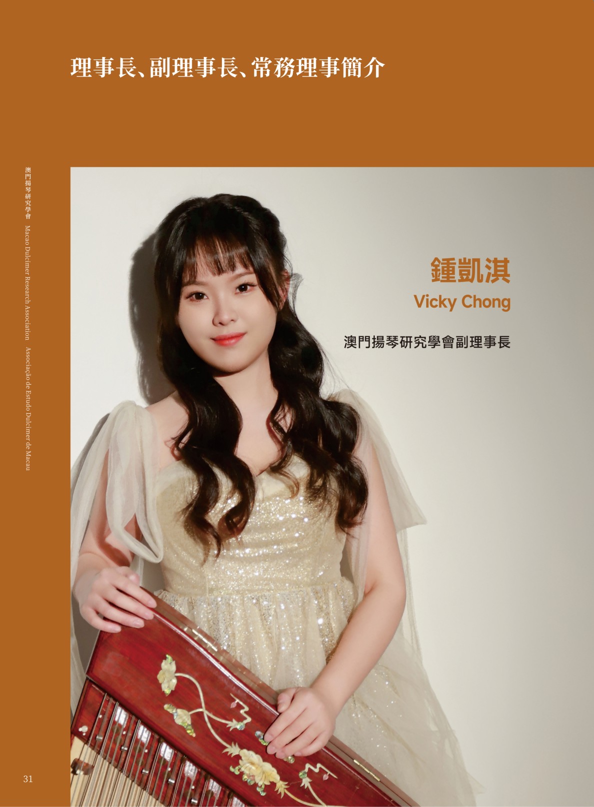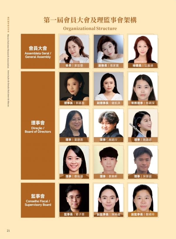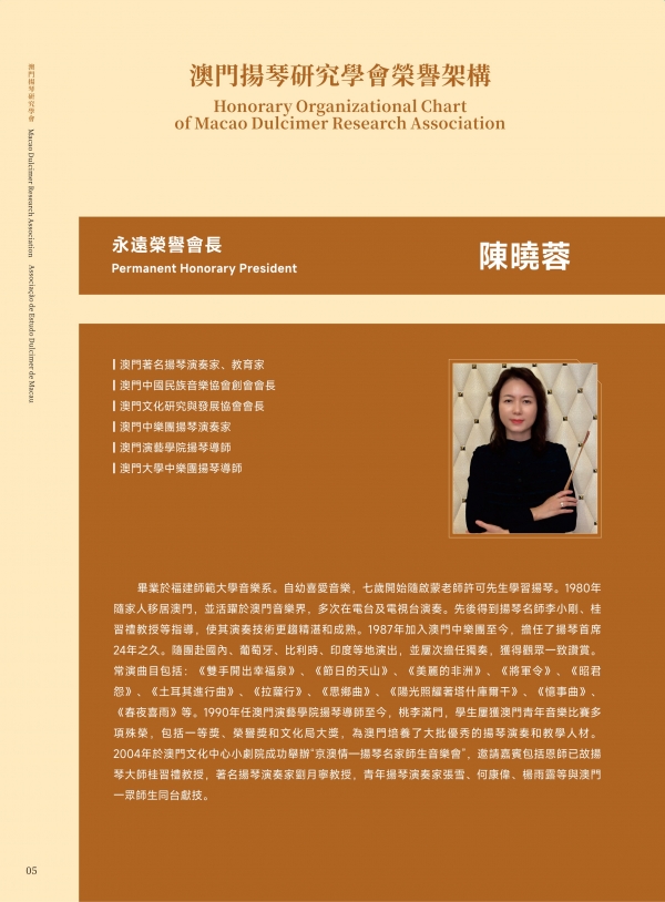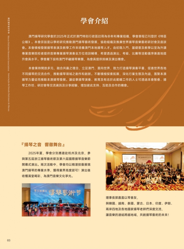 澳门扬琴研究学会成立于 2025 年,为澳门特区正式注册之非营利专业组织,学会章程已刊登于《特区公报》。学会以学术研究与推广扬琴艺术为宗旨,积极投入表演、教学与国际研讨,并设有“澳门芊翩扬琴乐团”为会员提供演出机会。