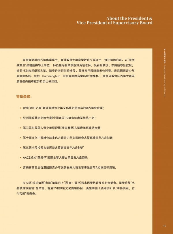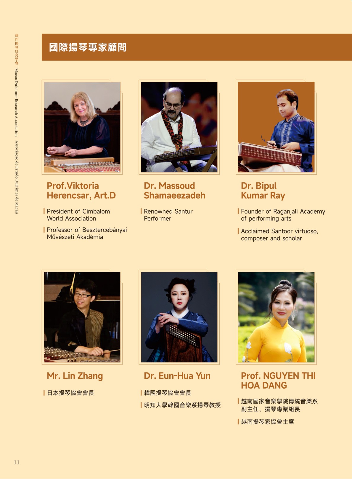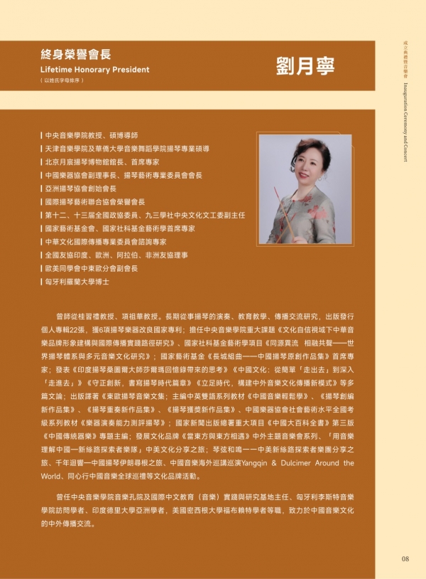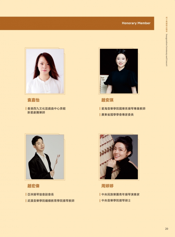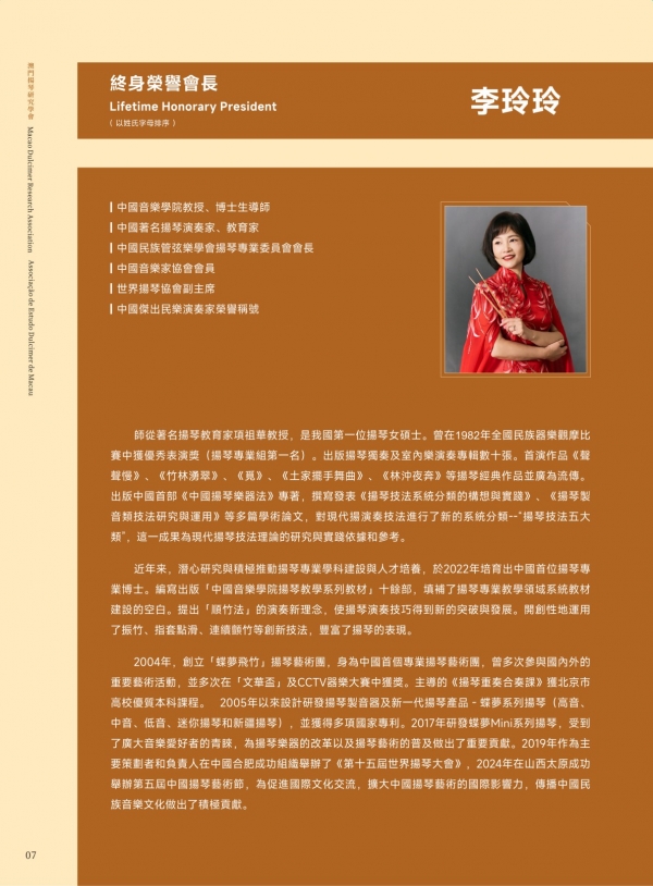 仪式在澳门科技大学人文艺术学院Dr. Matthew A. Haywood、澳门大学Dr. Javier Cuervo、中央民族大学薛澍老师、澳门中乐团扬琴首席李柔老师等专家学者与业界同仁们的见证下顺利举行。学会自筹组以来,广受全球扬琴专家与同仁关注支持。目前,学会海内外荣誉领导架构阵容鼎盛,包括世界扬琴大会主席Prof. Viktoria Herencsar、学会终身荣誉会长黄河教授、李玲玲教授、刘月宁教授(以姓氏字母排序)。涵盖超过六十位专家成员,来自海峡两岸暨港澳地区、匈牙利、伊朗、印度、日本、韩国、越南、新加坡、马来西亚等地,充分得到国际认可与影响力。