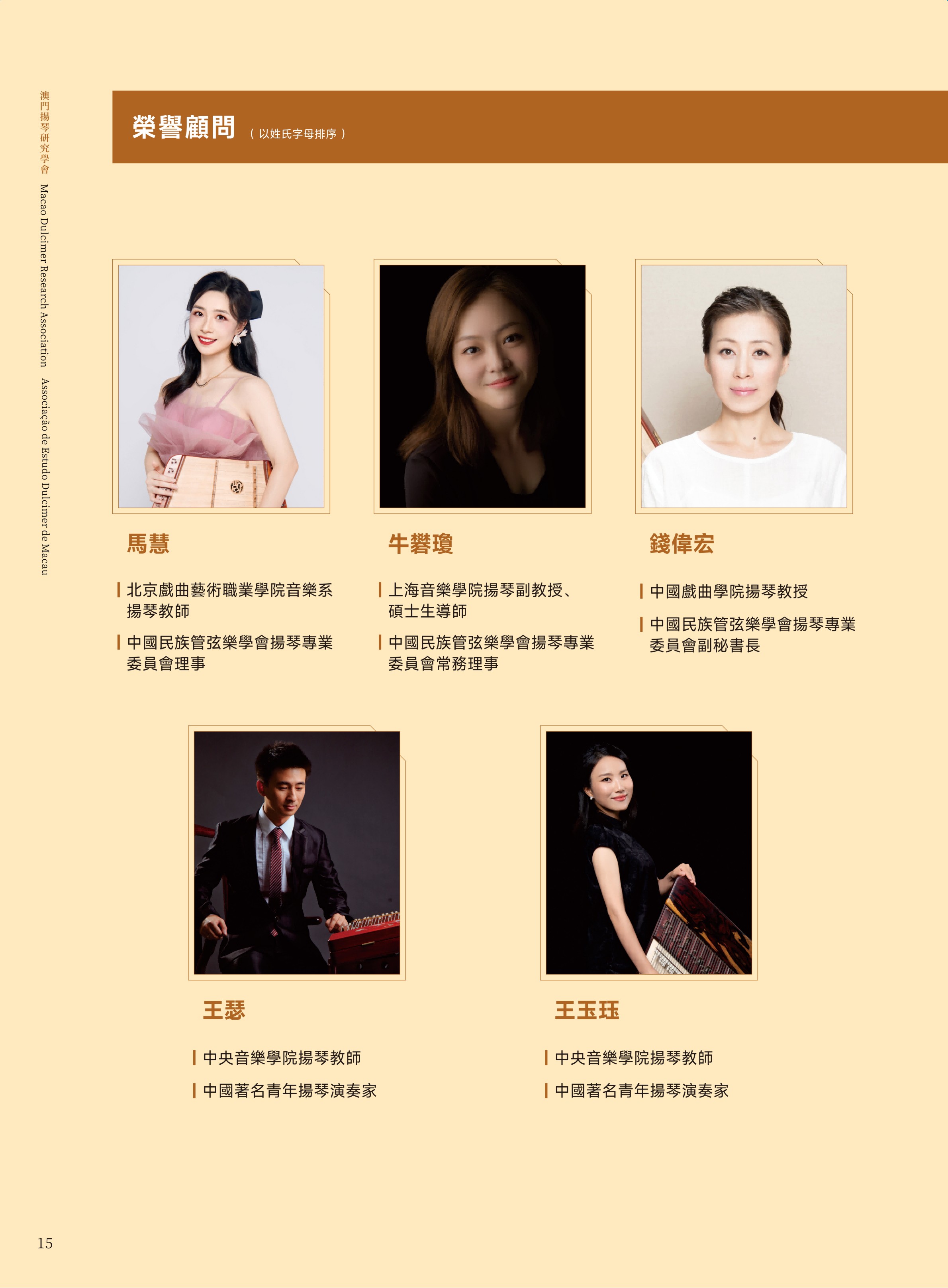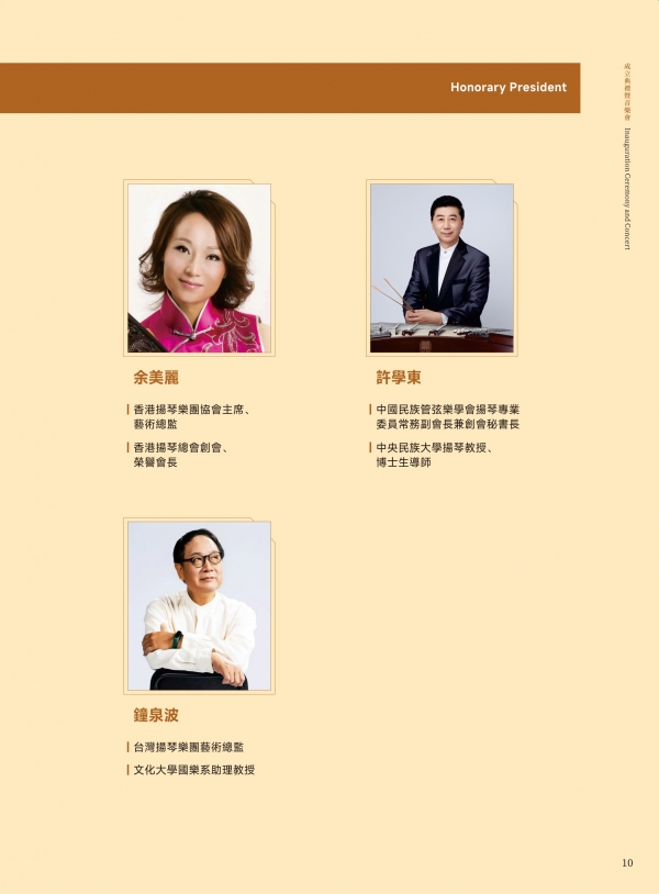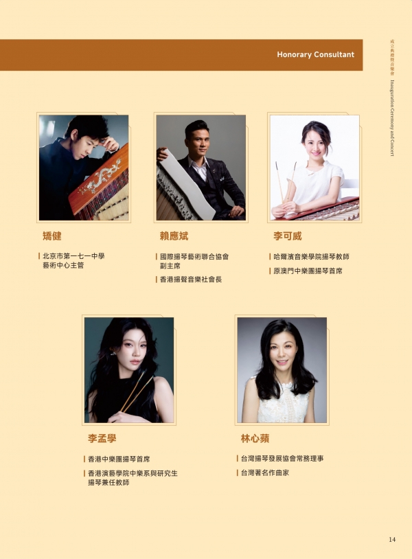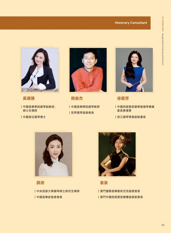 澳门文化局演艺活动处陈淑美处长;澳门文化界联合会副会长、澳门乐团有限公司董事、澳门青年交响乐团理事长许健华先生;澳门中乐团音乐总监兼首席指挥张列先生;中国音乐学院博士生导师、中国民族管弦乐学会扬琴专业委员会会长李玲玲教授;东方基金会驻澳门办事处柯天玲主任;澳门城市大学音乐学博士课程负责人戴定澄教授;香港扬琴总会创会及荣誉会长余美丽老师;中国乐器协会扬琴专业委员会副会长、澳门国际音乐艺术交流协会会长袁泉老师;澳门著名扬琴教育家、澳门扬琴研究学会永远荣誉会长陈晓蓉老师。