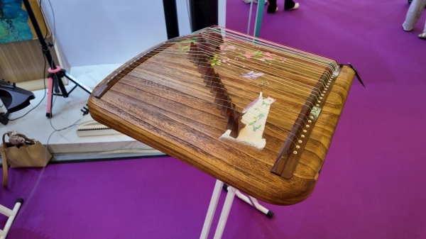 在保留传统音色的前提下,我把琴身设计为方形结构,呼应去年圆形的星回古筝,延续“天圆地方”的理念,体积也相对其它29弦古筝更便携,并且提供素面、彩绘等三种木色选择。同时,这款琴面向6级以上古筝学习者——既需掌握21弦基础,又能驾驭29弦的复杂表现力。这款古筝也特别适合自媒体创作者,展会到现在,也有很多人被它吸引。