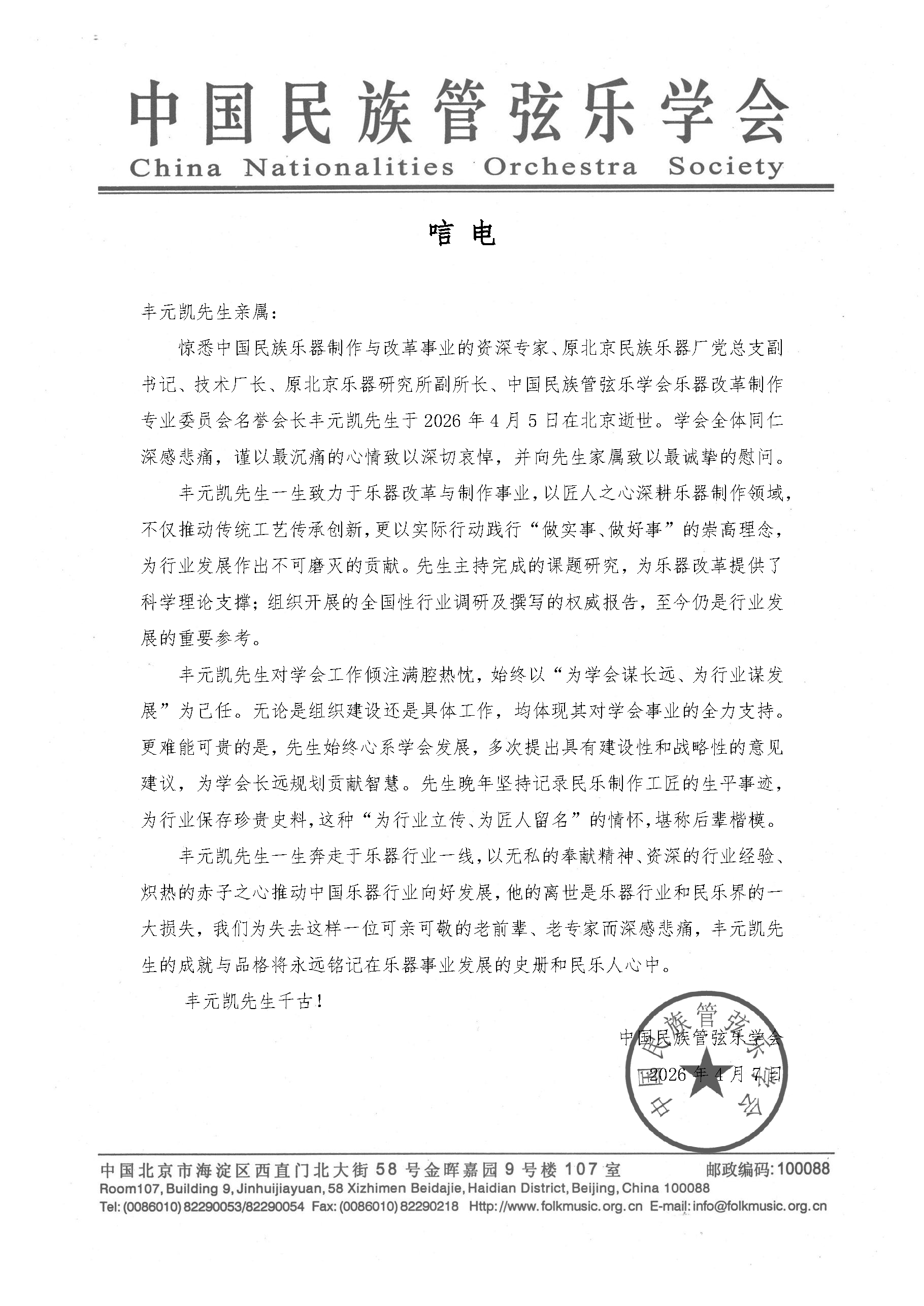 中国共产党党员、中国乐器行业资深专家、民族乐器改革制作家、中国乐器行业史料研究与器乐文化传播学者,中国民族管弦乐学会乐器改革制作专业委员会名誉会长、原会长丰元凯先生,因病医治无效,于2026 年 4 月 5 日在北京逝世,享年 80 岁。