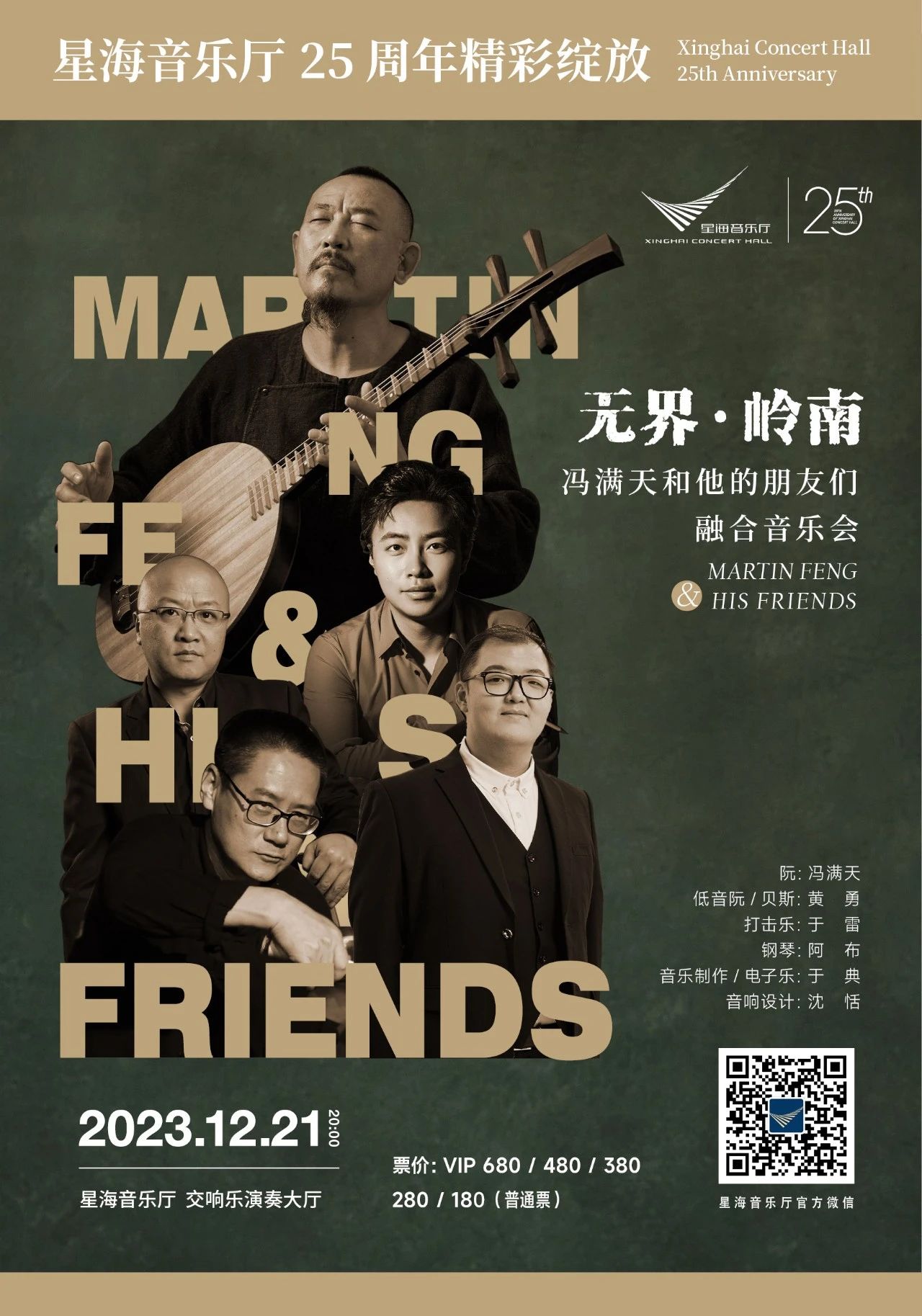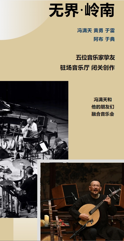 12月,星海音乐厅携手著名阮演奏家冯满天及一众才华横溢的音乐家,深入温暖富饶的岭南,以乐器为媒介,以乐思为激荡,以 “无界” 为理念,在为期一周多的 “驻场创作计划” 支持下,跨越乐种,突破边界,全新创作并演绎他们最富激情的集体之作。