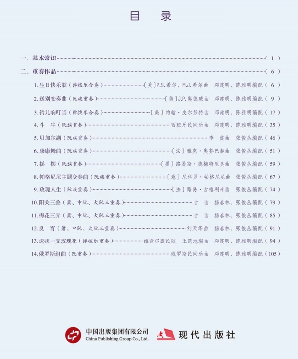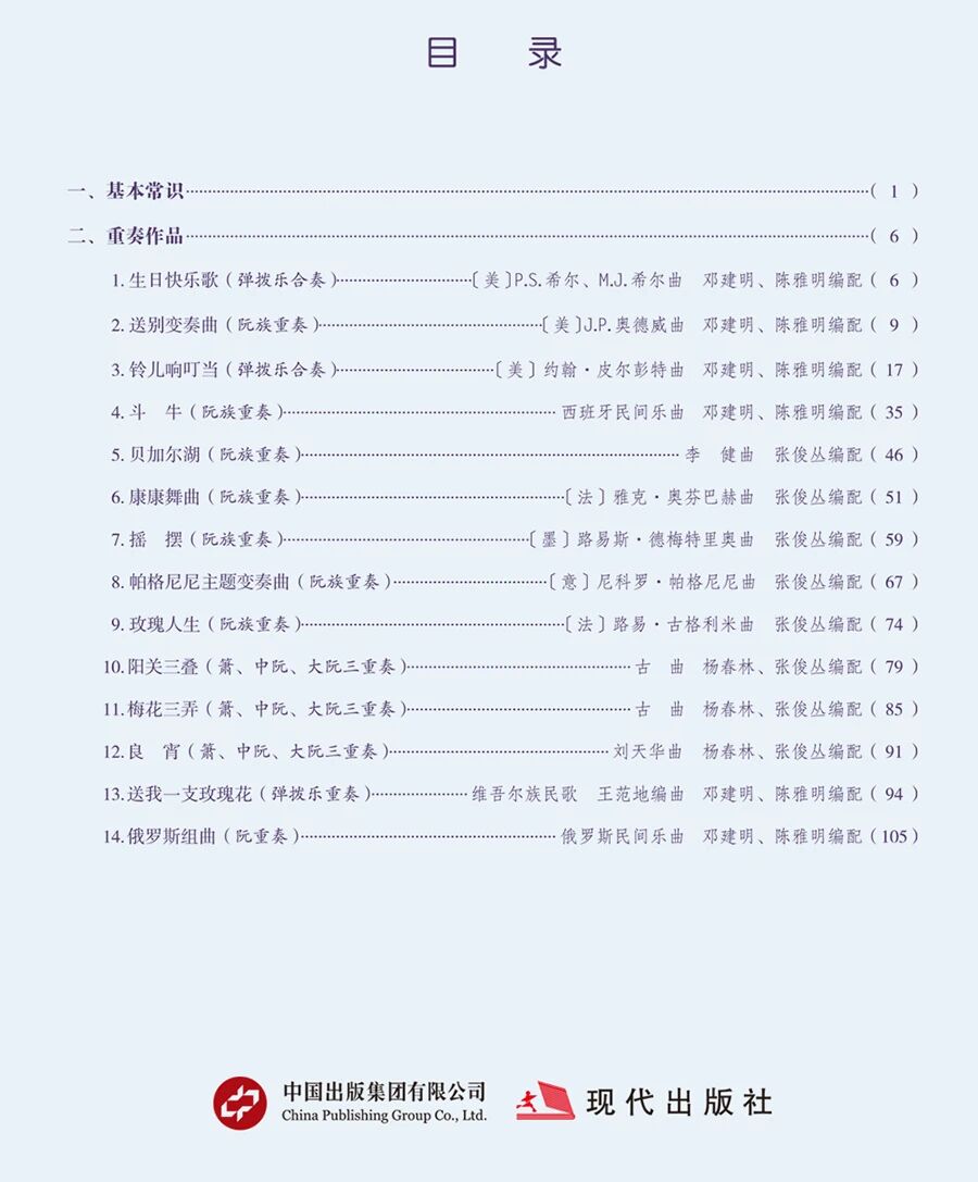阮族重奏,魅力无穷,是其他乐器无法比拟的。本教材也是为提高演奏者的实践兴趣而编写,希望通过演绎本教材中的作品,使他们在排练中感受音乐的乐趣和魅力,培养合奏意识和重奏能力,并在乐队中找到自身定位、注重整体配合。