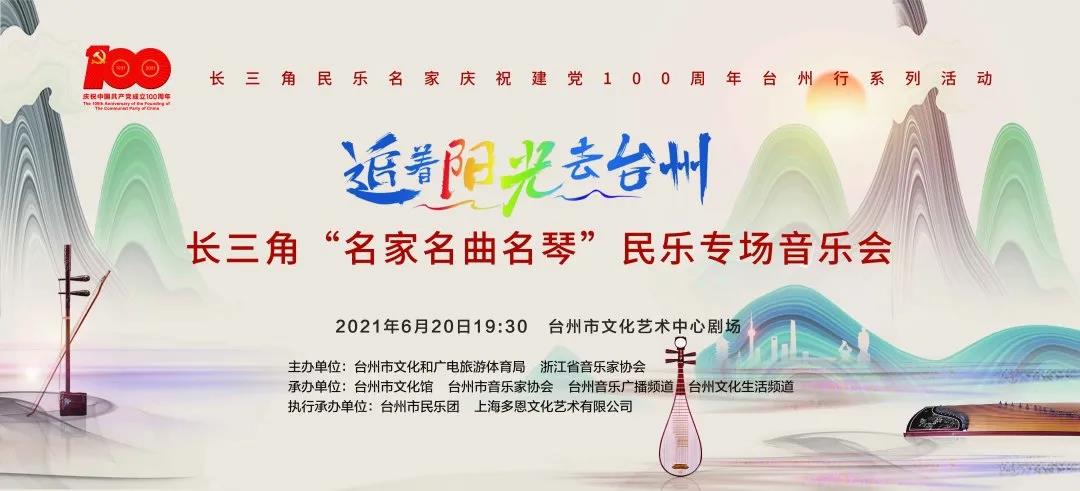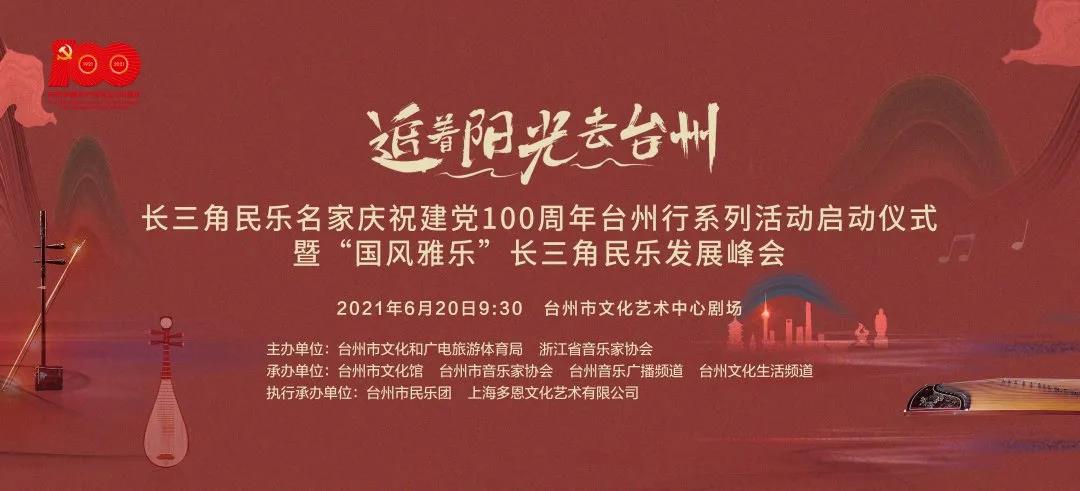 6月20日,由台州市文化和广电旅游体育局、浙江省音乐家协会共同举办的“追着阳光去台州”长三角民乐名家庆祝建党100周年台州行系列活动,将在台州市文化艺术中心剧场启动。