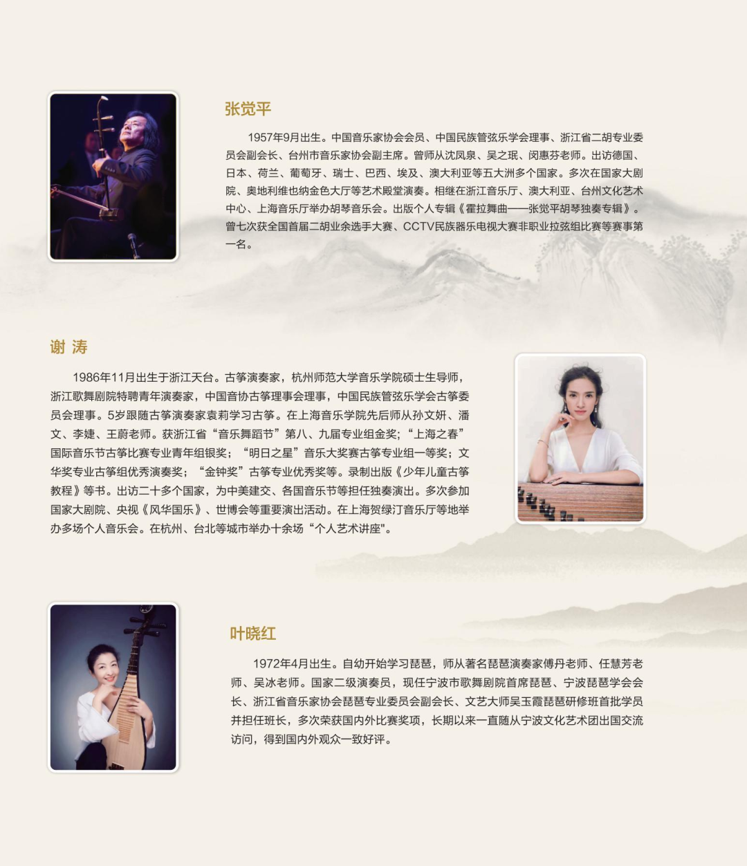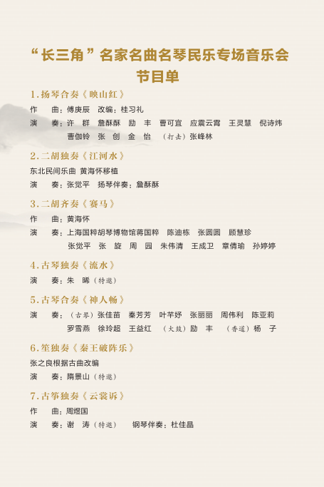 特邀演奏的名家有:国家级非遗项目古琴艺术(虞山琴派)代表性传承人、中国民族器乐学会副会长朱晞古琴独奏《流水》,我国首位唢呐硕士研究生、安徽皖派唢呐艺术研究院院长隋景山笙独奏《秦王破阵乐》,古筝演奏家谢涛独奏《云裳诉》,中央音乐学院民乐系教授、博导赵寒阳二胡独奏《洪湖主题随想曲》,上海民族乐团青年柳琴演奏家唐一雯独奏《雨后庭院》,笛子演奏家、浙江省民族管弦乐学会副会长蒋国基笛子独奏《水乡船歌》,琵琶演奏家傅丹和宁波市歌舞剧院首席琵琶叶晓红领奏《唱支山歌给党听》等。