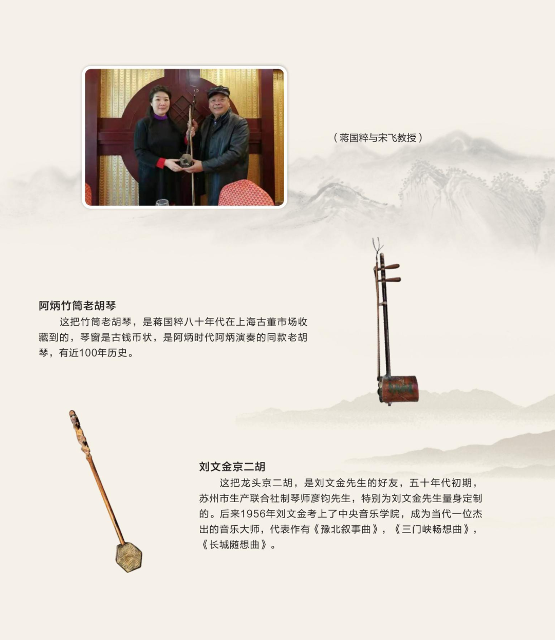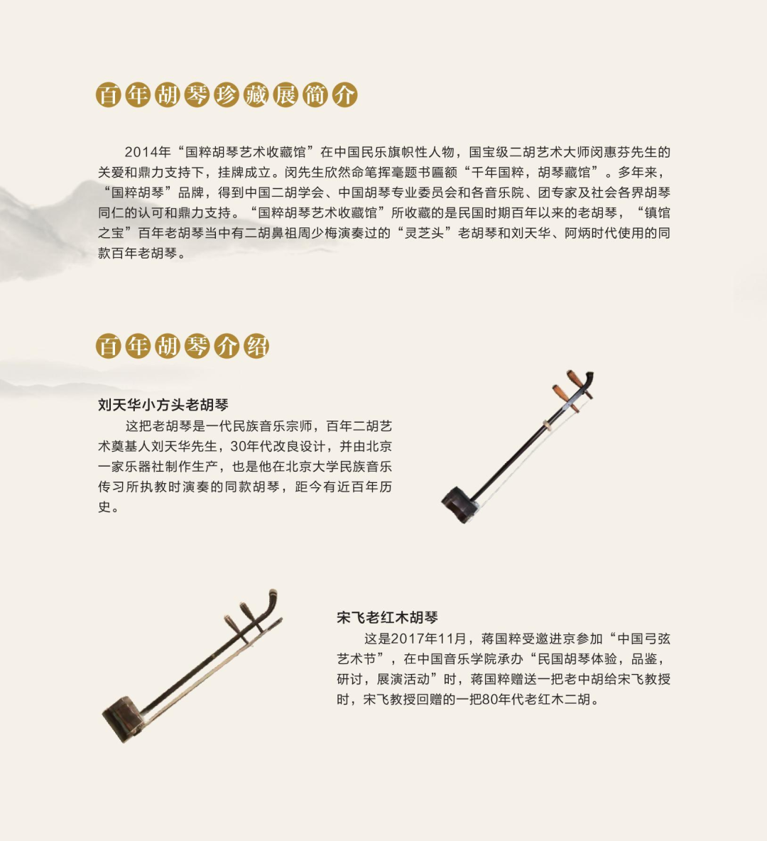 国粹胡琴艺术收藏馆提供了百年精品胡琴名琴参加此次展览。“镇馆之宝”百年老胡琴中包括了二胡鼻祖周少梅演奏过的“灵芝头”老胡琴富等。
