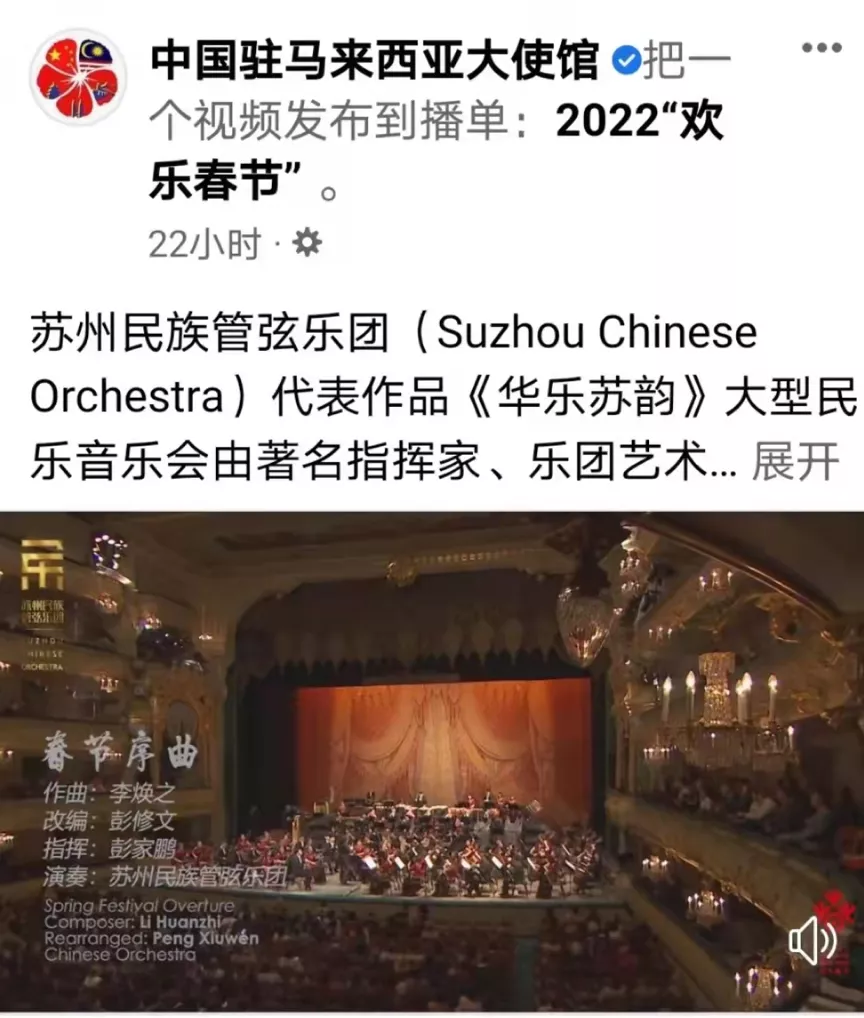 在马来西亚,中国驻马大使馆通过海外媒体平台播放了「华乐苏韵」大型民族音乐会,为当地华人华侨送上了特别的2022“欢乐春节”礼物。