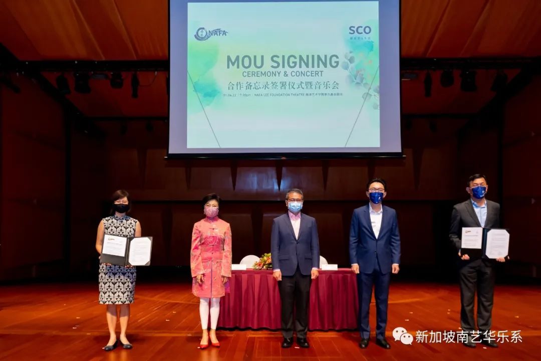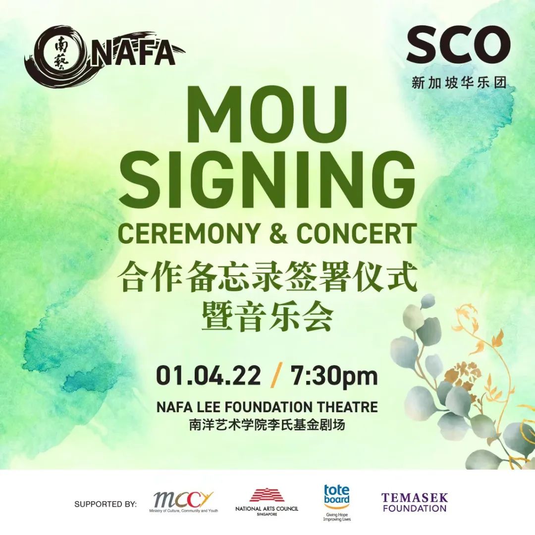 2022年4月1日晚七时半假新加坡南洋艺术学院李氏基金剧场,在文化、社区及青年部长兼律政部第二部长唐振辉的见证下,新加坡南洋艺术学院(简称南艺)与新加坡华乐团正式签署合作备忘录。这份合作备忘录由南艺院长苏惠兰和新加坡华乐团行政总监何伟山签署。自2015年以来, 南艺与新加坡华乐团双方关系密不可分,签署备忘录旨在巩固双方合作关系,加强推广、普及和提升华族传统文化艺术与音乐。签署仪式之后,双方也特别举办一场由新加坡华乐团和南艺师生联合呈现的音乐会,纪念这一重要时刻。