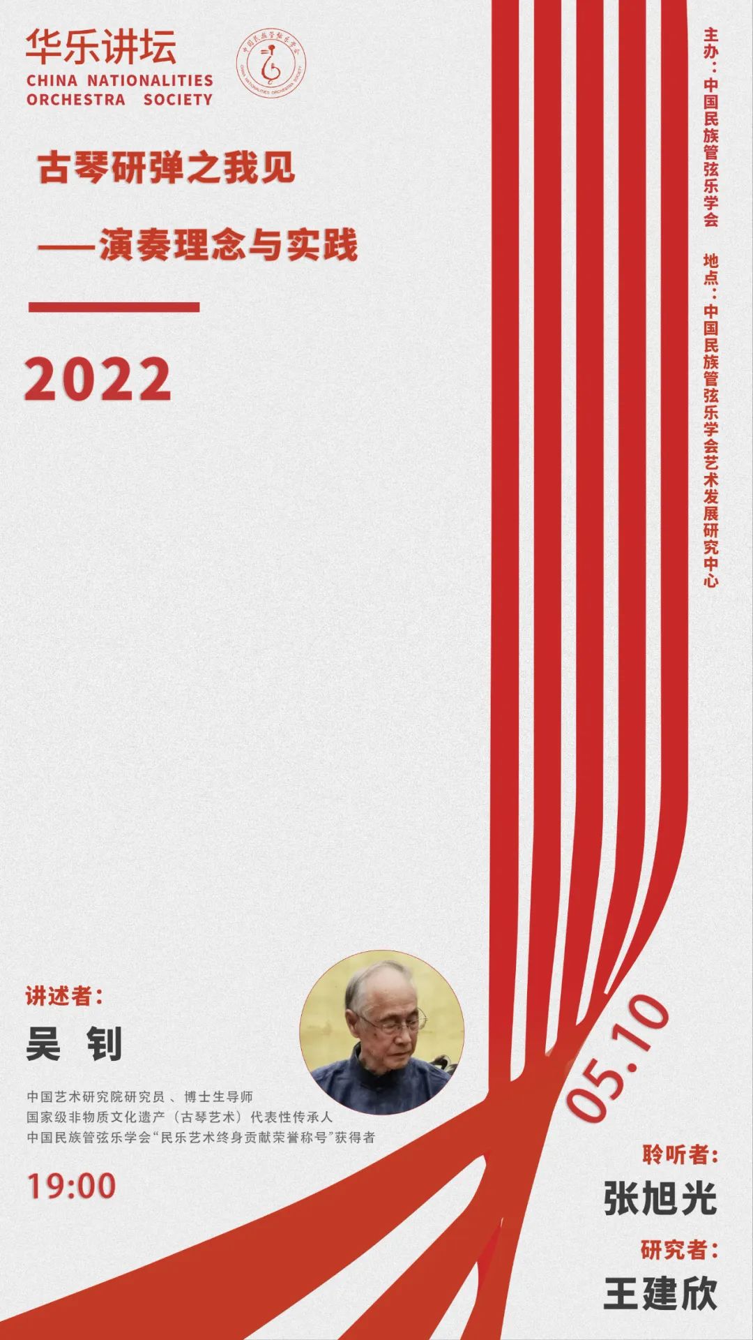 “华乐讲坛”第5讲将于5月10日晚七点在中国民族管弦乐学会艺术发展研究中心举行,国家级非物质文化遗产(古琴艺术)代表性传承人、中国艺术研究院研究员、博士生导师、中国民族管弦乐学会“民乐艺术终身贡献荣誉称号”获得者吴钊先生开讲《古琴研弹之我见——演奏理念与实践》,欢迎大家关注。
