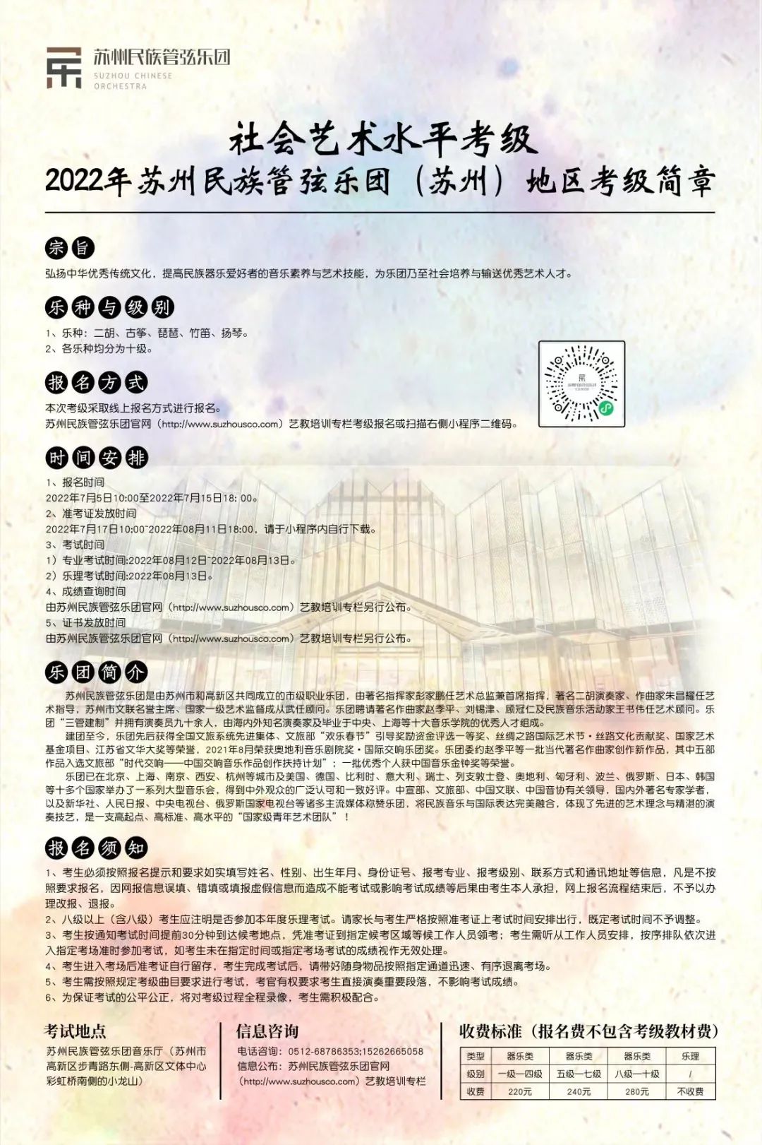 苏州民族管弦乐团官网(http://www.suzhousco.com)艺教培训专栏考级报名或扫描下方小程序二维码进行报名。