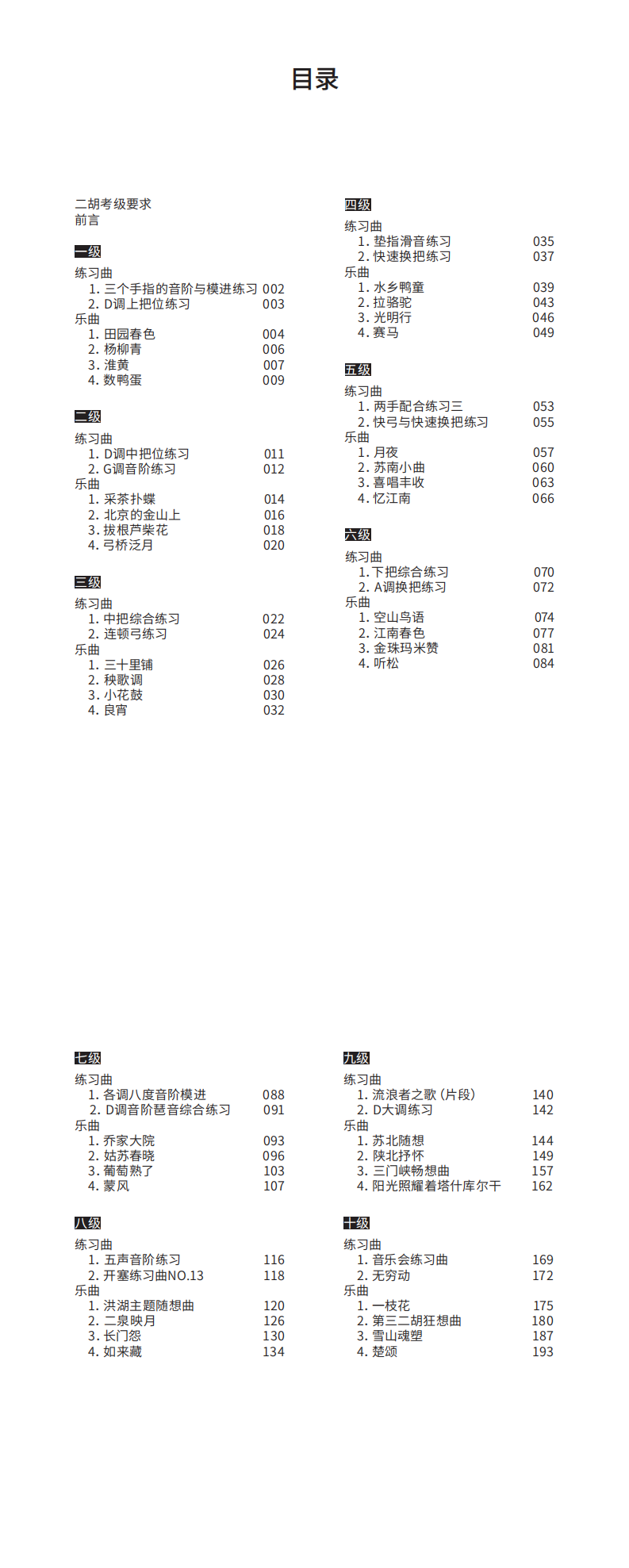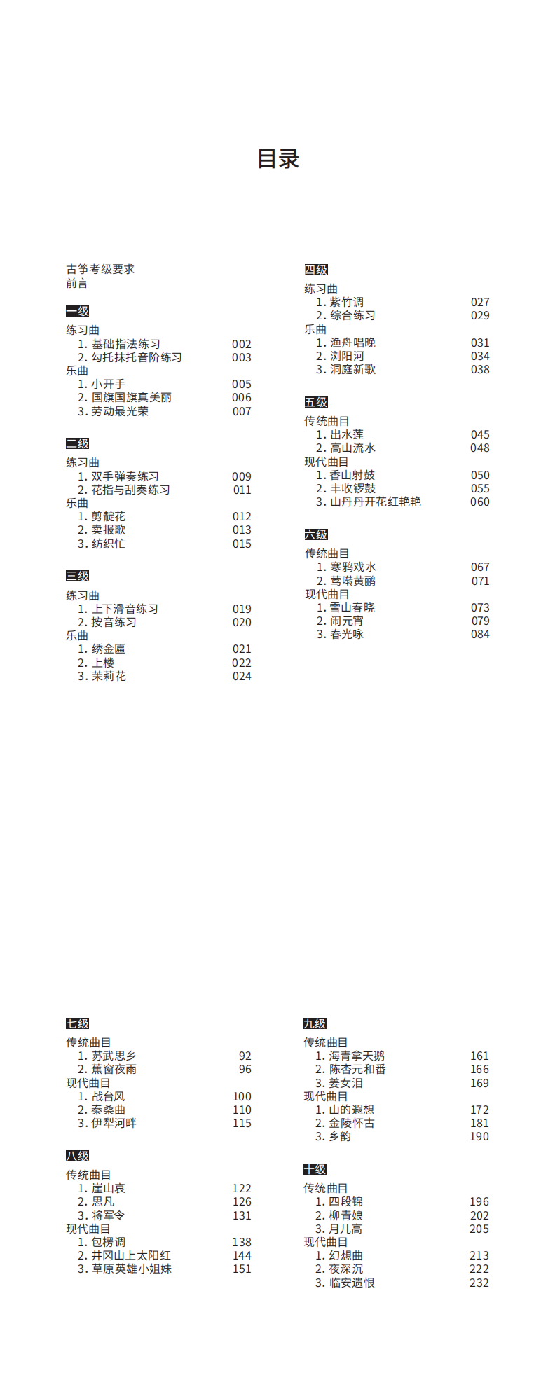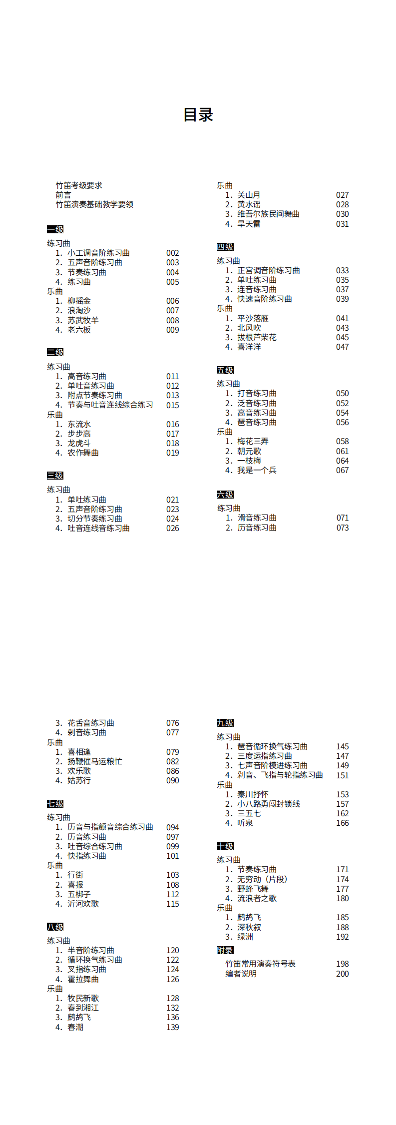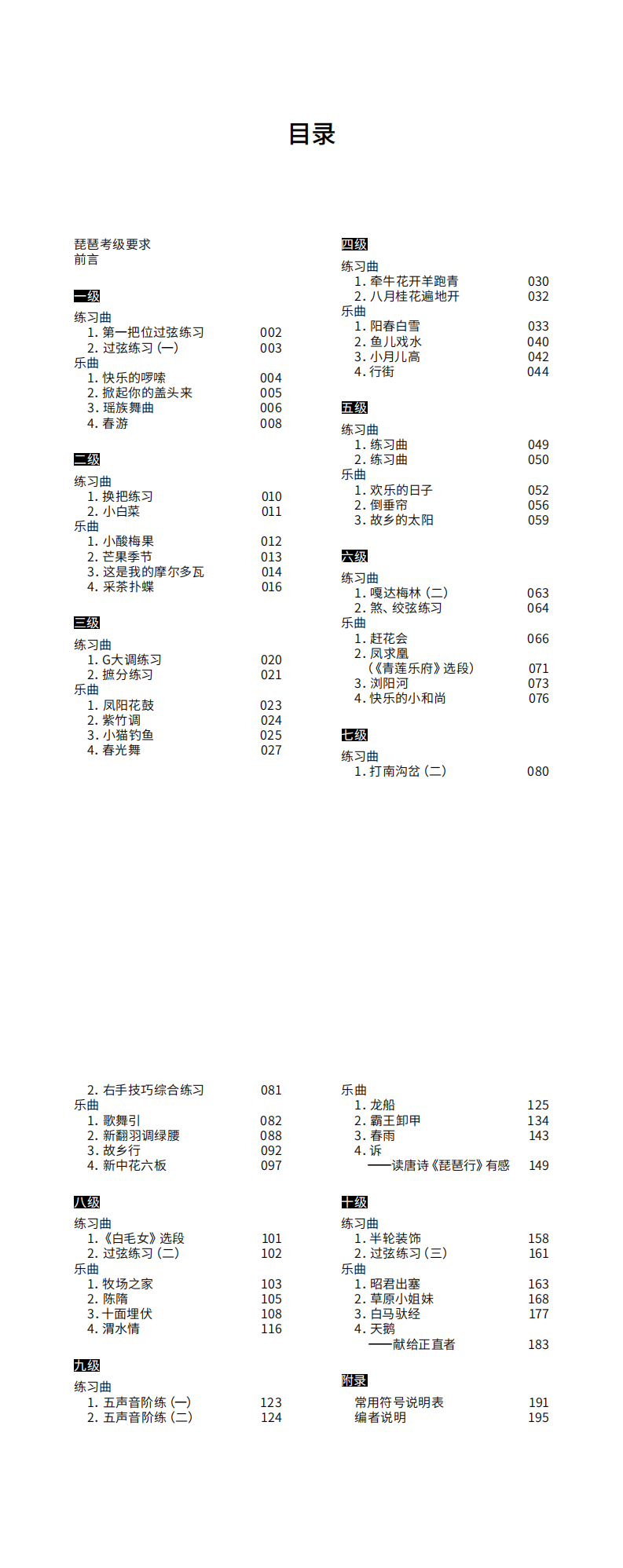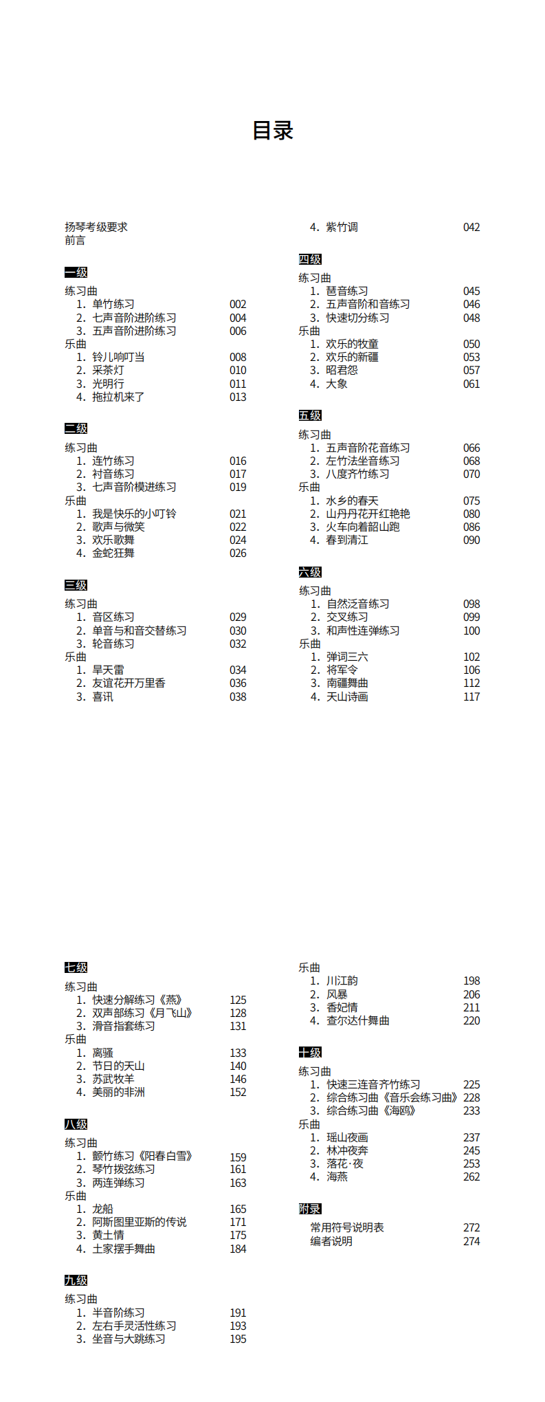 三、本教材每级分设“练习曲”与“乐曲”两部分内容,考生须依据教材在所报级别中任选一首练习曲和一首乐曲参加考试。