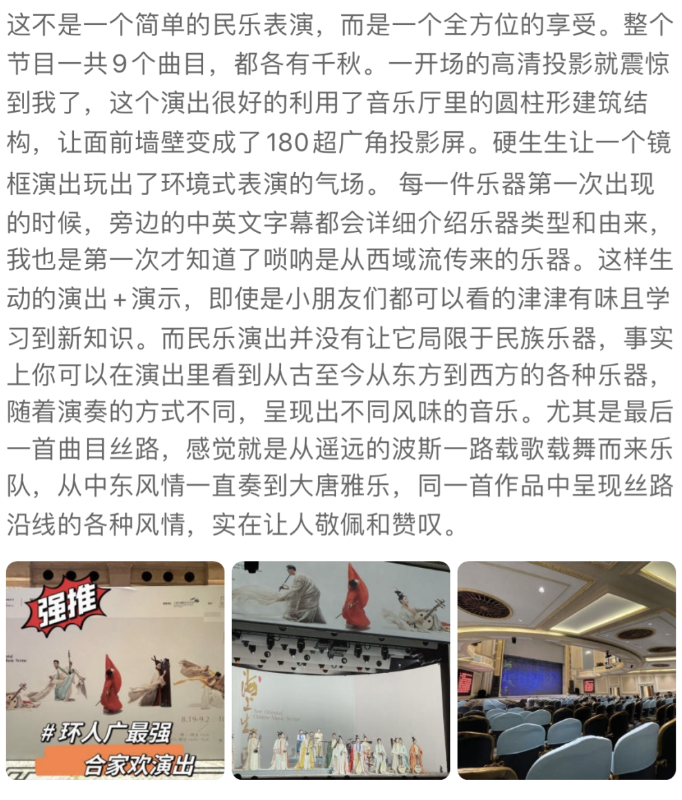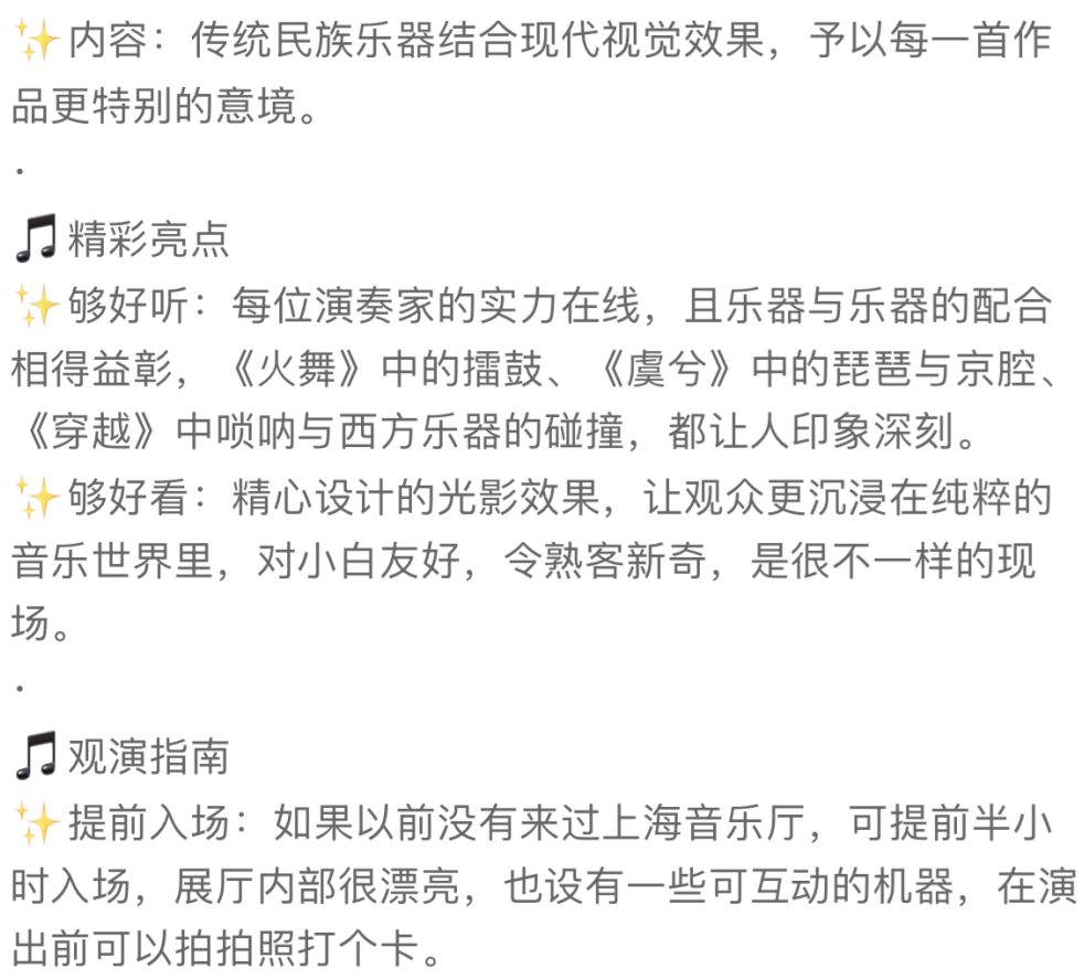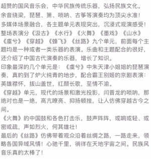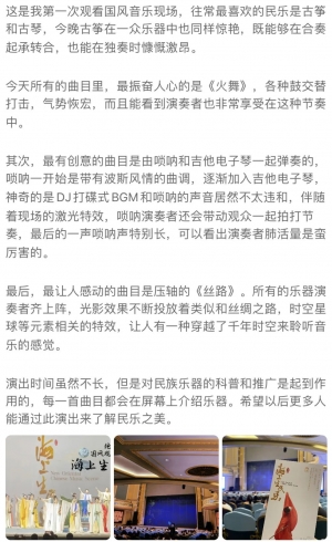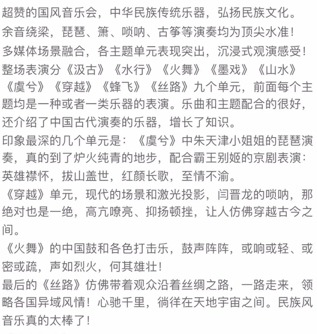 整场音乐会仿佛感受到了中国民族音乐发展的历史,每种乐器都能够创作营造出不同的氛围感受,给人沉浸式的享受。最为印象深刻的是新改编的《虞兮》,琵琶与京剧的结合非常震撼,台上演奏家的每个音符、每个动作,甚至表情都充满感染力,而这份感动只有身在现场才能感受到。