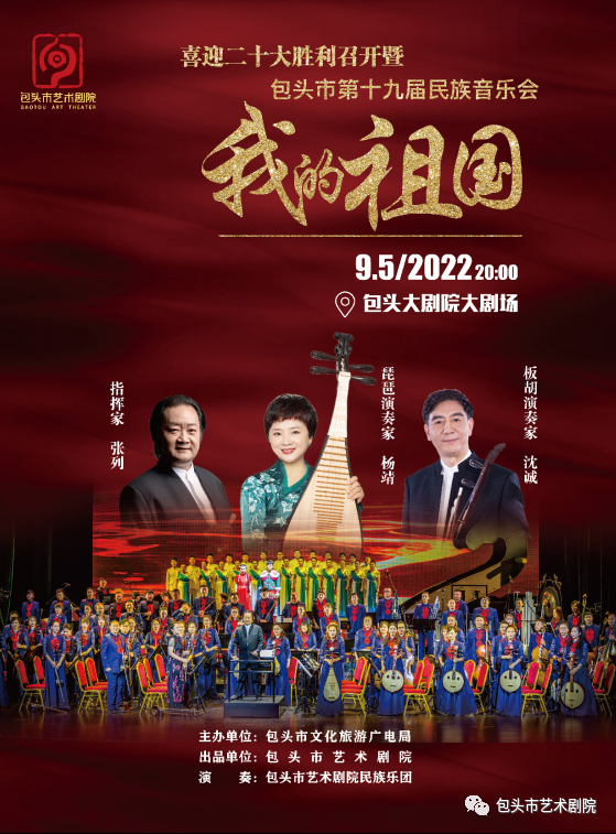9月5日晚,由包头市文化旅游广电局主办,包头市艺术剧院承办的——2022包头市艺术剧院喜迎党的二十大胜利召开包头市第十九届民族音乐会【我的祖国】,在包头大剧院奏响!特邀中国民族管弦乐杰出指挥家张列先生、中国音乐学院教授、著名演奏家沈诚先生以及杰出琵琶演奏家、中国音乐学院教授杨靖女士联袂出演。