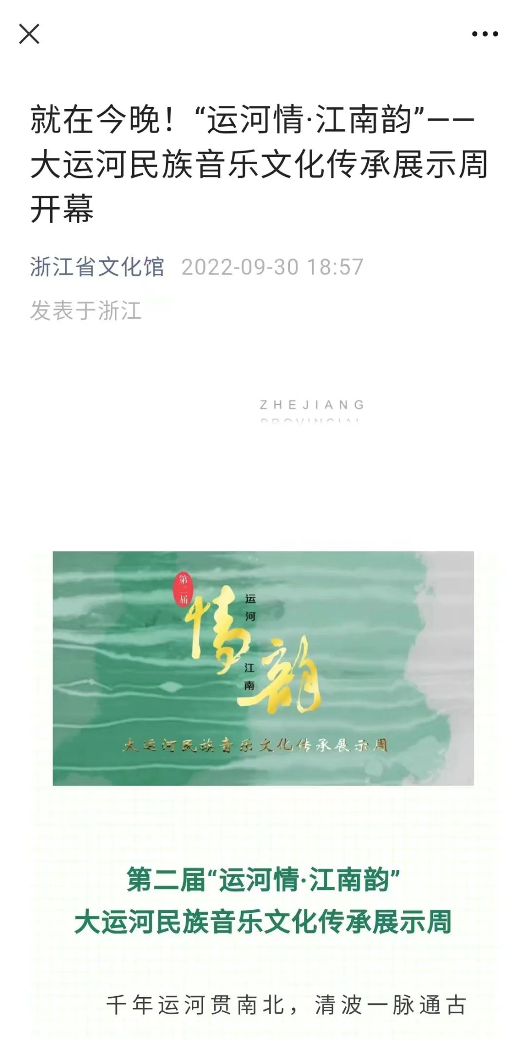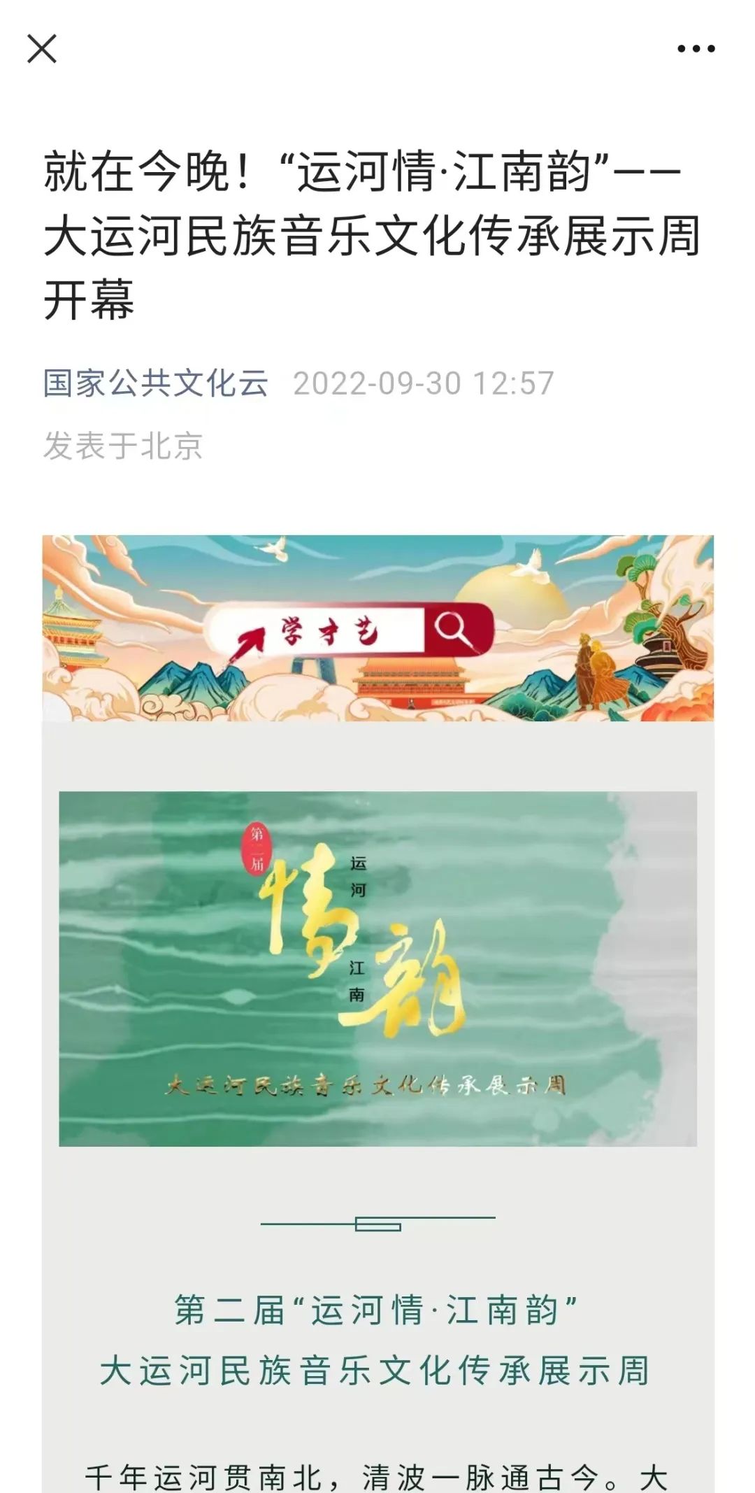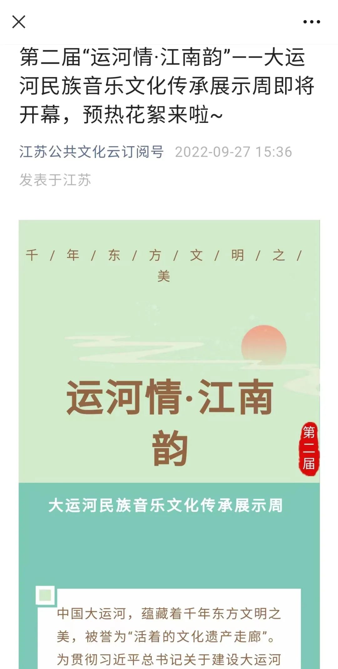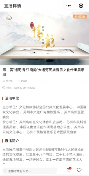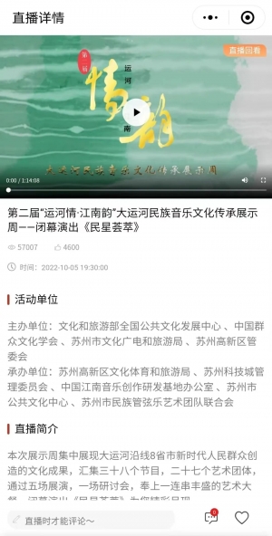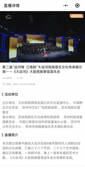 大运河民族音乐文化传承展示周是为贯彻习近平总书记关于建设大运河文化带、弘扬中华优秀传统文化的重要指示精神,以实际行动迎接党的二十大胜利召开,进一步展示新时代大运河文化带建设的最新成果所打造的主题鲜明、内容丰富、影响广泛、群众喜闻乐见的大运河活动品牌,也是第四届大运河博览会的重要活动之一。展示周由文化和旅游部公共服务司指导,文化和旅游部全国公共文化发展中心、中国群众文化学会、苏州市文广旅局、苏州高新区管委会主办,大运河沿线8省市文化馆(站)、苏州民族管弦乐团等联合举办。据统计,在本次为期6天的展示周中,累计共60万人次“云”聚线上,共享这场群众文艺的盛会。