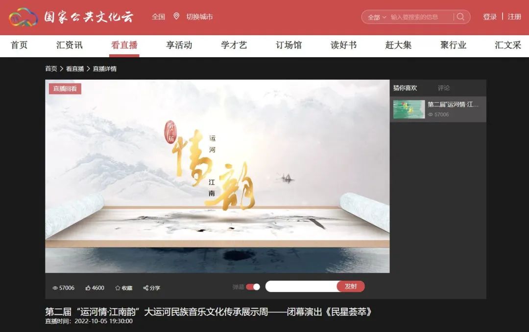 鲜明的主题、丰富的节目与优秀的质量,成为了本次展示周的特色,评弹、快板、歌舞、扬州清曲、民乐、武术、杂技等轮番亮相,可谓应有尽有。为更好地彰显“云”力量,展示周系列活动在线上“全面开花”,通过国家公共文化云首页、哔哩哔哩、喜马拉雅、YouTube、Facebook、视频号、国家公共文化云苏州民族管弦乐团专区、苏州民族管弦乐团数字音乐厅、大运河沿线8省市公共文化云专区等多个国内外平台同步播出,以文艺陪伴群众的国庆长假,让观众足不出户就可以品味运河文化、欣赏群众文艺精品。据不完全统计,国庆期间,仅国家公共文化云平台,点击量就超过24万,成为文化云最受群众关注与欢迎的活动之一,极大地提升了“大运河民族音乐文化传承展示周”这一运河品牌与群众文化品牌的影响力。