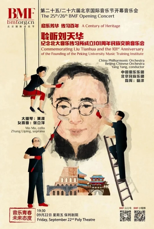 为纪念北大音乐传习所成立101周年,纪念以刘天华为代表的老一辈音乐家的突破与创新精神,纪念文化之都北京文脉庚续的伟大使命,2023年9月22日19:30分,第二十五/二十六届北京国际音乐节开幕音乐会将以“启乐芳华 传习百年”为主题,在北京保利剧院上演《聆听刘天华》纪念北大音乐传习所成立101周年民族交响音乐会。