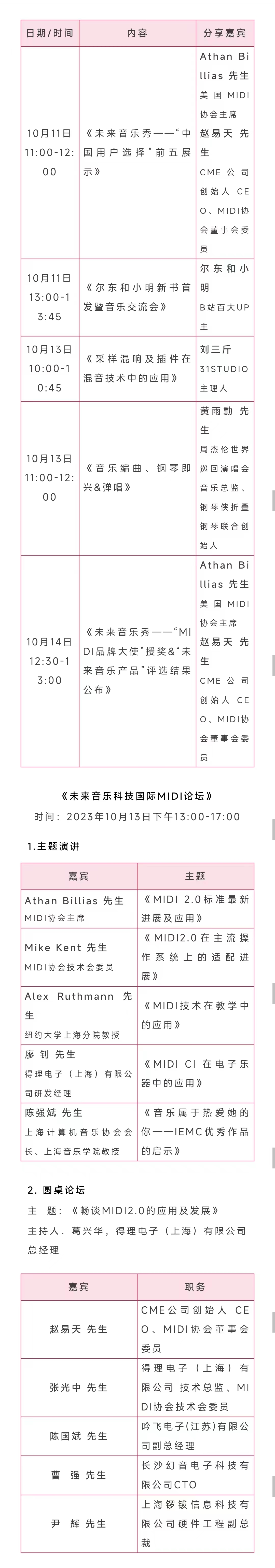 内 容:国际MIDI技术应用与发展论坛、未来音乐秀、“未来音乐产品”评选、音乐科技产品展示、新品发布、玩家分享等。