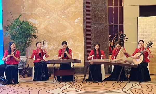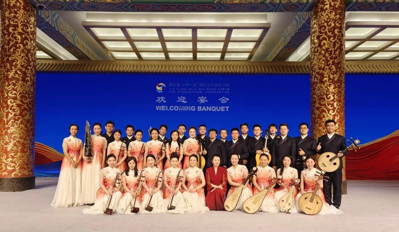 10月17日晚,中央民族乐团6名演员还参加了于长富宫饭店举办的第三届“一带一路”国际合作高峰论坛地方专题论坛的欢迎晚宴,为与会嘉宾们演奏了《彩云追月》《茉莉花》《赛马》《春江花月夜》等十首耳熟能详的中国传统经典乐曲,用优美动人又颇具中国特色的乐音向来自世界各地的外宾们送上衷心的欢迎与祝愿。宴会现场,不少外宾还热情地与乐队演员们合影留念。
