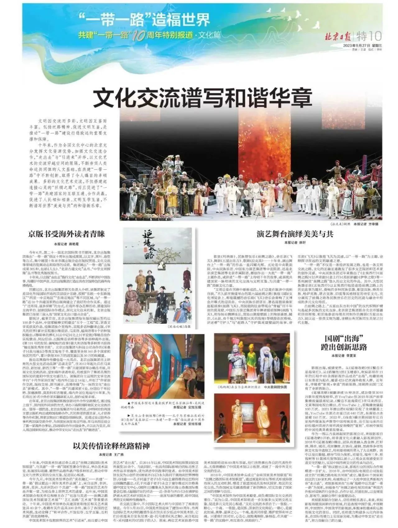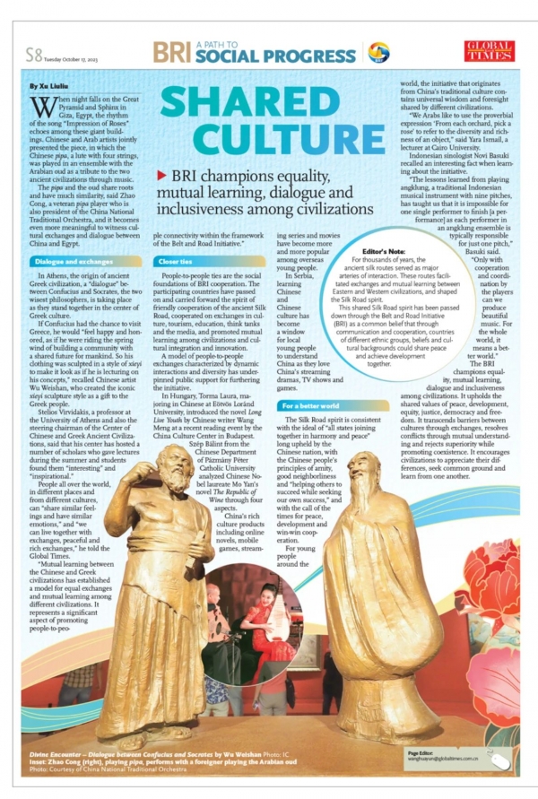 10月17日,《环球时报》推出一带一路特刊,在文化交融板块中,记者以中央民族乐团今年3月在埃及金字塔畔与埃及民族音乐演奏家共同奏响合美乐章的事例作为开篇,并引用赵聪团长所言,琵琶与乌德琴本就同根同源,两件乐器的同台,也再次见证了中国与埃及两国友好的文化交流与文明互鉴。