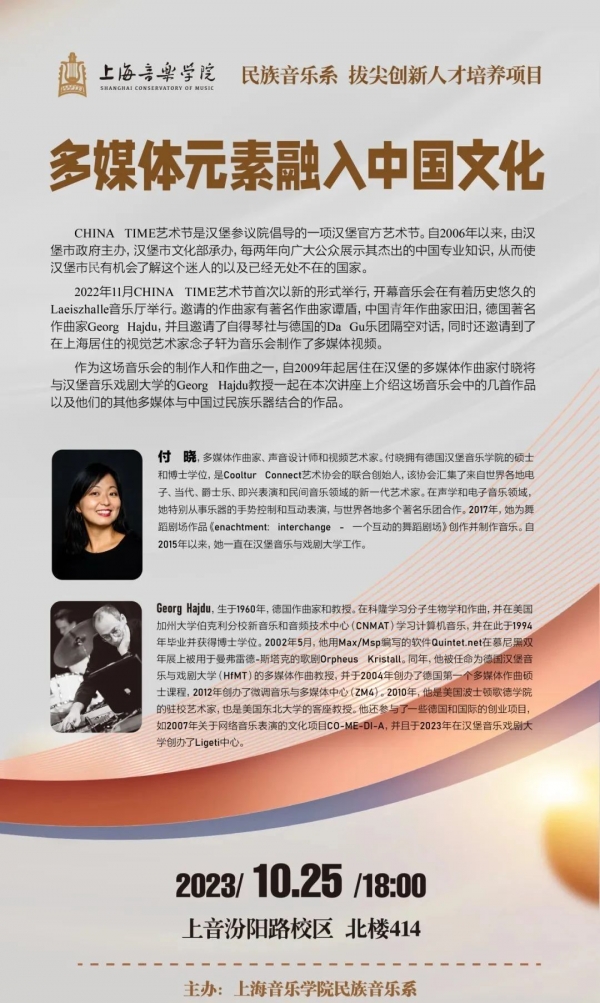 付晓,多媒体作曲家、声音设计师和视频艺术家。付晓拥有德国汉堡音乐学院的硕士和博士学位,是Cooltur Connect 艺术协会的联合创始人,该协会汇集了来自世界各地电子、当代、爵士乐、即兴表演和民间音乐领域的新一代艺术家。在声学和电子音乐领域,她特别从事乐器的手势控制和互动表演,与世界各地多个著名乐团合作。