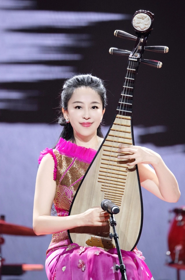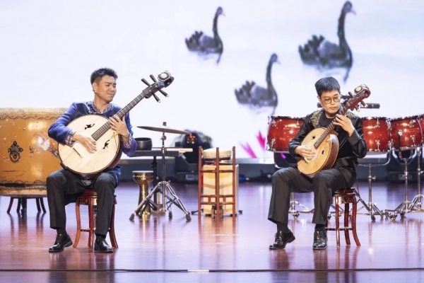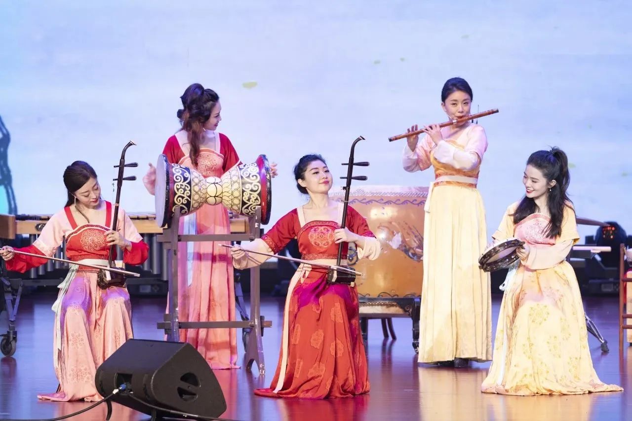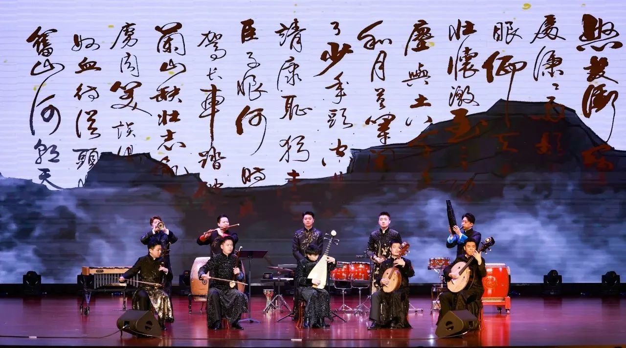 紧接着,“青衫渡”“俪人行”接续登台,《光明行》与《踏歌》再现了他们的“初舞台”,《桃花源》与《梅边四梦》展现当代民族室内乐的学院派风范,《雨打芭蕉》《花伞与兰花》《流水》将传承之意融入曲中,《满江红》《北京故事》将创新之情赋予舞台,中阮、大阮二重奏《浏阳河》将阮的动人音色与人声结合,把意韵与激情融于一曲,引发了现场热烈的掌声,音乐会在《敦煌》的恢弘音色中进入尾声。