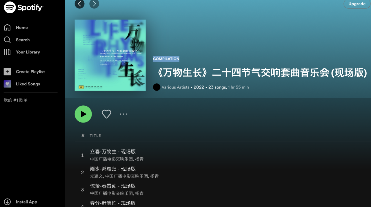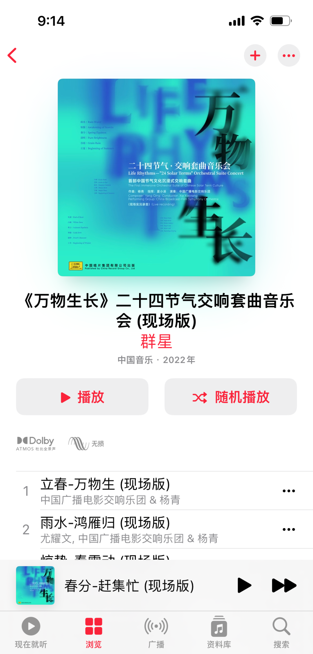 杜比全景声数字专辑(Dolby Atmos音乐会live版)由中唱杜比全景声技术倾力打造,通过专业和高品质的录音制作技术最大限度还原音乐现场,专业团队赴中国广播艺术团(中国电影乐团)演出现场进行录制收音,打造更加真实、立体的音频空间,让不同角度、不同层次的音乐声、环境声全方位包裹着听者的感官,带来“身临其境”般的沉浸听感享受。春分时节热闹的市井烟火气、清明时节淅淅沥沥的雨声,自由萦绕在听众的四周,时空交叠,仿佛乘船入画,置身于自然优美的田园画卷,感受岁时流转的别样浪漫。现已上线Apple music空间音频专区,并在YouTube、Spotify等海外平台同步发布。