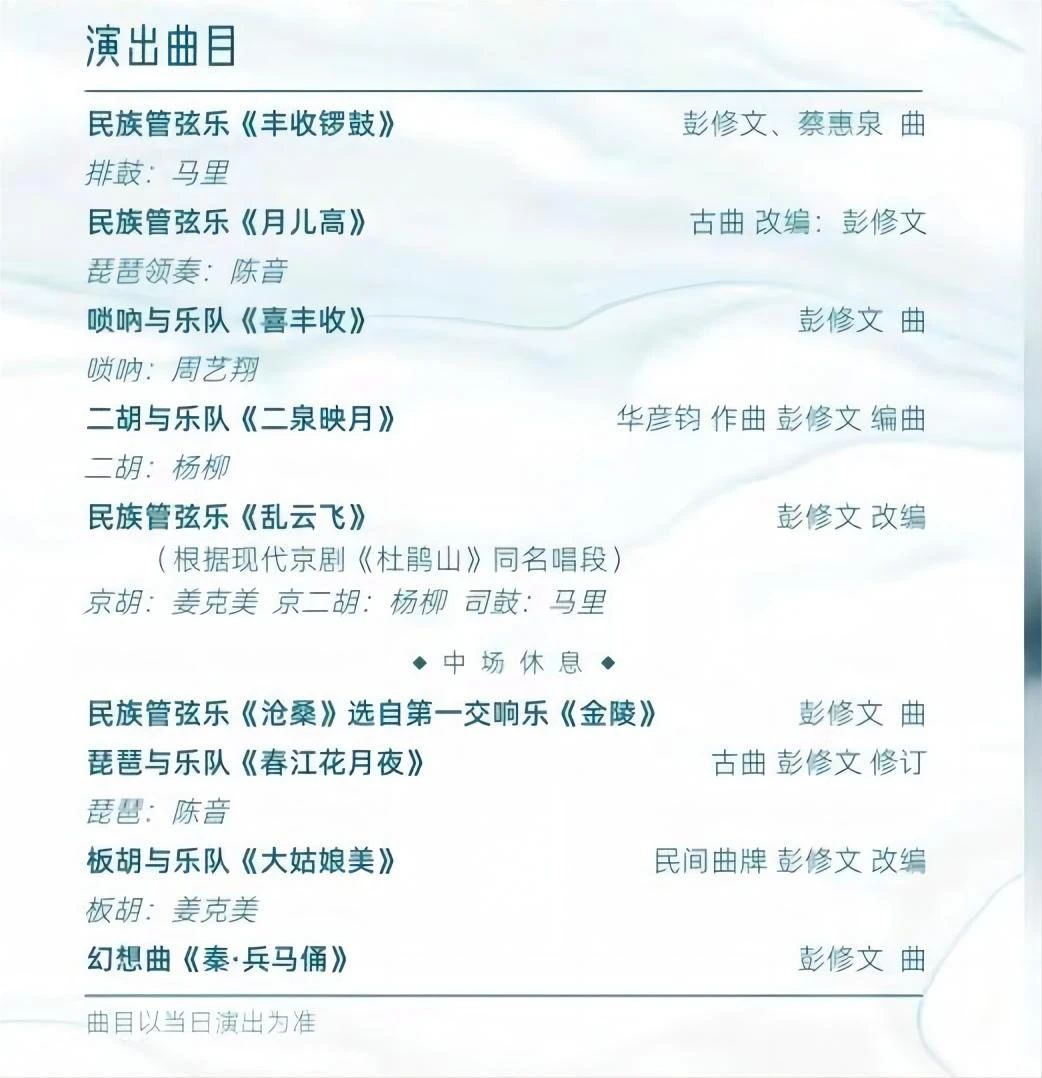 为纪念和缅怀彭修文先生为中国民族音乐艺术发展做出的突出贡献,11月30日,“和韵管弦”中国广播民族乐团音乐会在国家大剧院隆重上演,著名指挥家彭家鹏执棒、著名胡琴演奏家姜克美、琵琶演奏家陈音、打击乐演奏家马里、二胡演奏家杨柳、唢呐演奏家周艺翔联袂演出,与乐队默契合作,集中上演了一批彭修文创作、改编的民族音乐经典曲目。现场观众沉浸在民乐金曲营造出的瑰丽意境之中,每一曲演奏结束,观众们都会报以经久不息的掌声和激情四射的欢呼声。