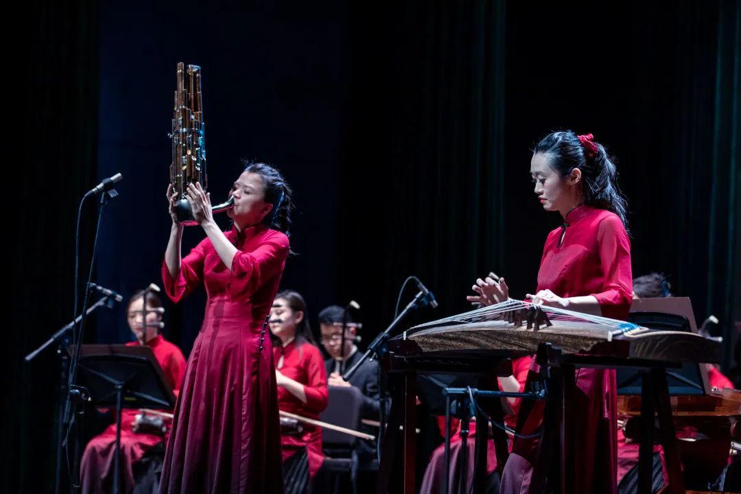 由朱昌耀编曲的《中外民歌联奏》为音乐会开篇,随后,民族器乐合奏《新康定情歌》、二胡齐奏“台湾民谣”四首联奏、古筝与笙二重奏《月是故乡明》、琵琶与乐队《樱花》等十余首耳熟能详的曲目接连上演,特邀青年歌唱家王婉佳带来女声独唱《太湖美》《青春舞曲》,欢乐的气氛层层推进。二胡与乐队“外国名曲”四首联奏迎来了一阵高潮,民族器乐对西方名曲的演绎让观众惊喜不已。