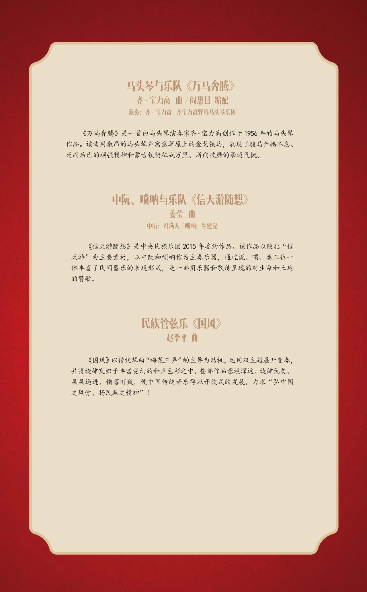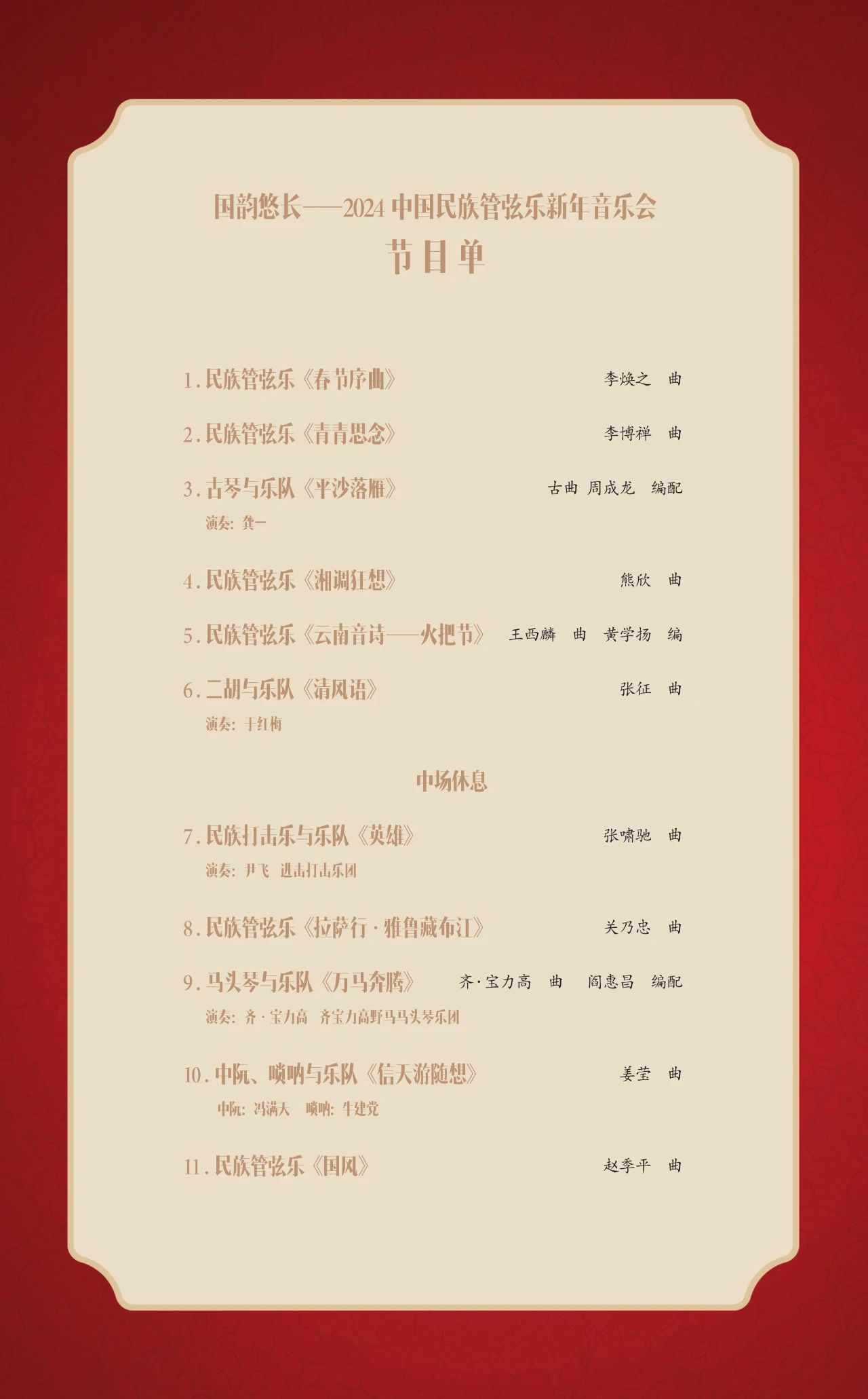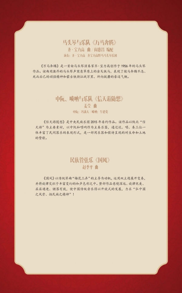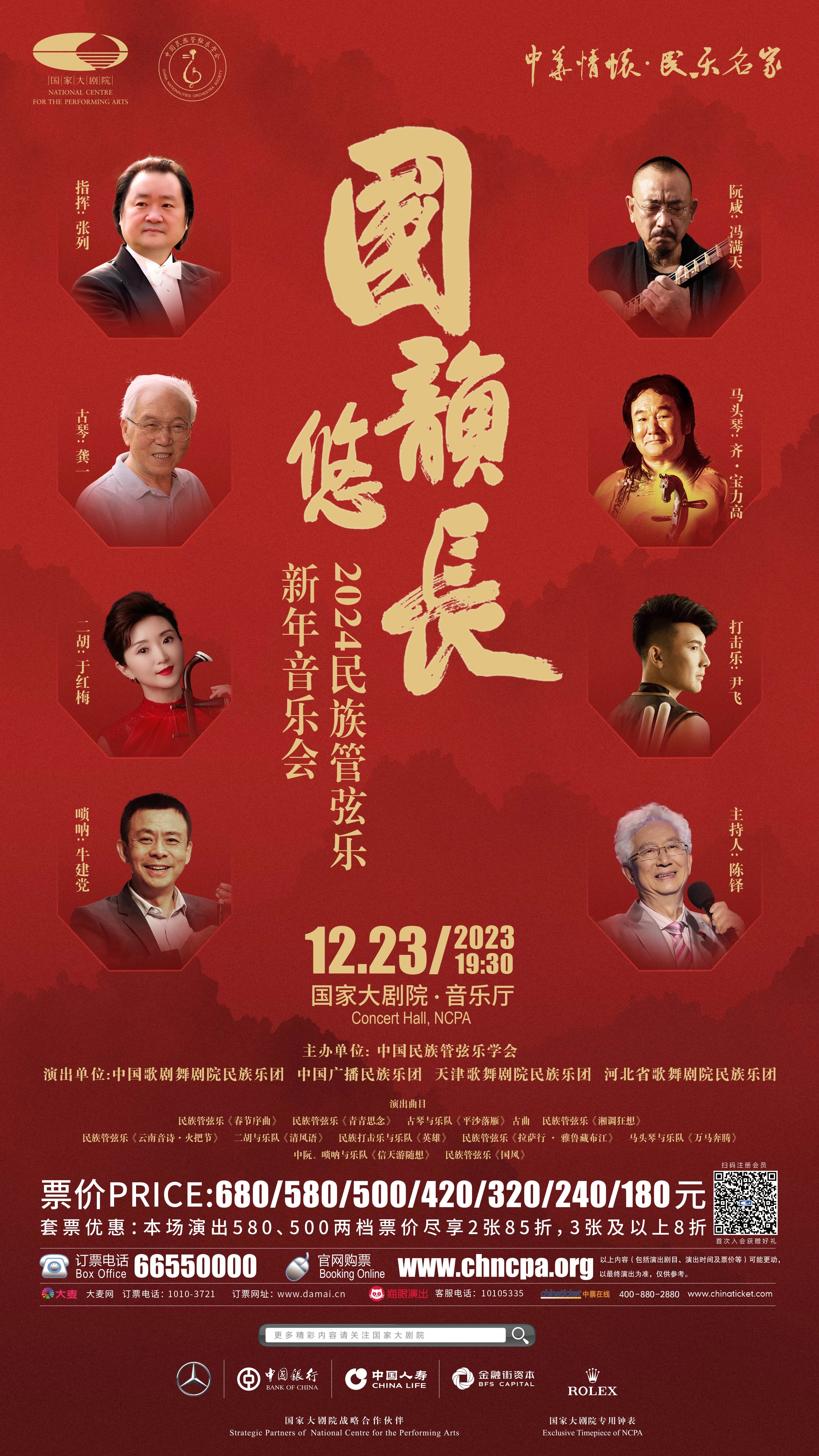 “国韵悠长——中国民族管弦乐新年音乐会”将于12月23日在国家大剧院音乐厅隆重上演。此次民乐界的盛典汇集了中国歌剧舞剧院民族乐团、中国广播民族乐团、天津歌舞剧院民族乐团、河北民族乐团4支京津冀三地的优秀音乐团体,由中国歌剧舞剧院民族乐团二胡演奏家林感担任联合乐团首席。独奏演员阵容星光璀璨,由著名指挥家张列执棒,携手古琴演奏家龚一、马头琴演奏家齐·宝力高、二胡演奏家于红梅、阮咸演奏家冯满天、唢呐演奏家牛建党、青年打击乐演奏家尹飞共同上演。音乐会特邀中央电视台著名主持人陈铎担任嘉宾主持。