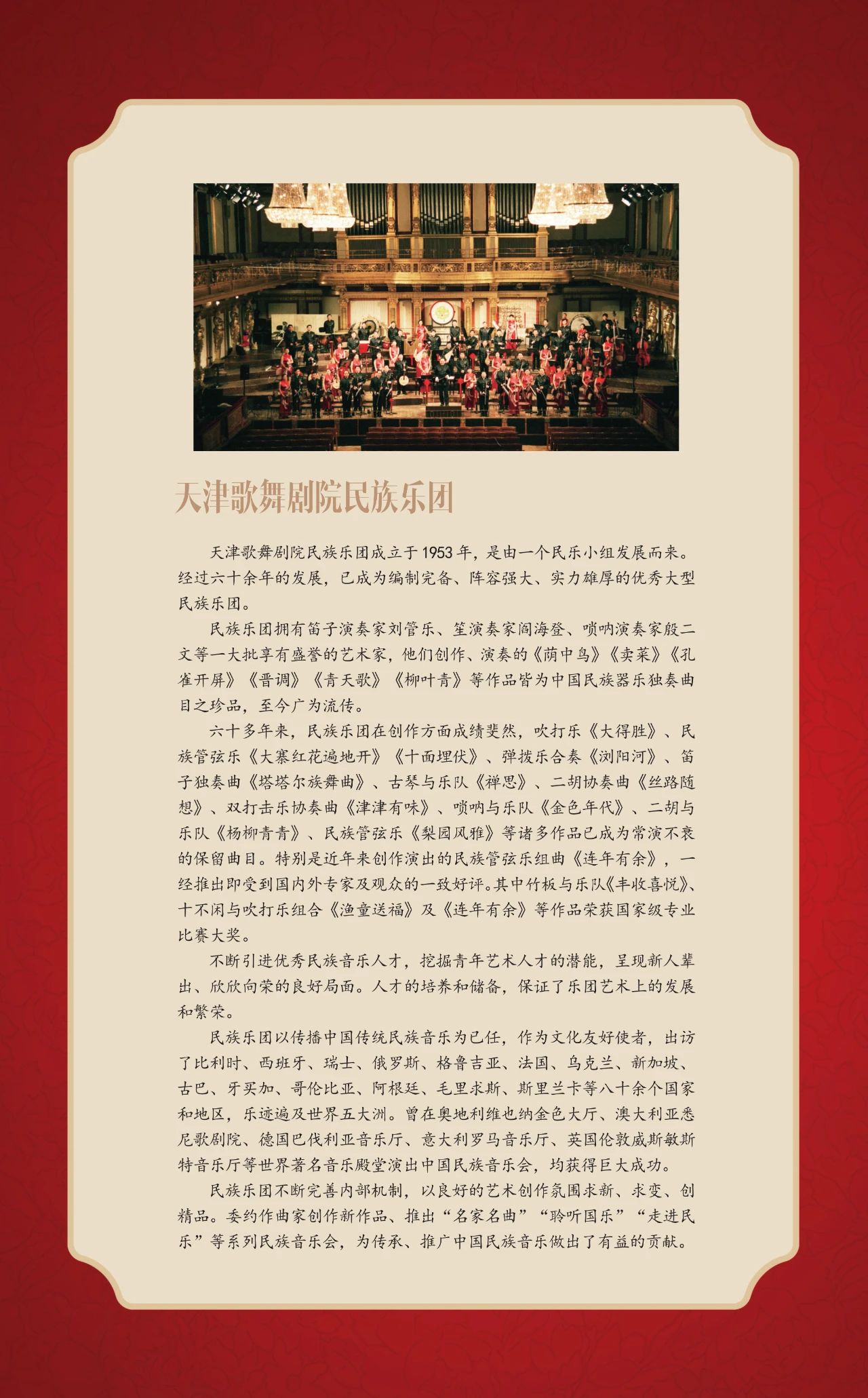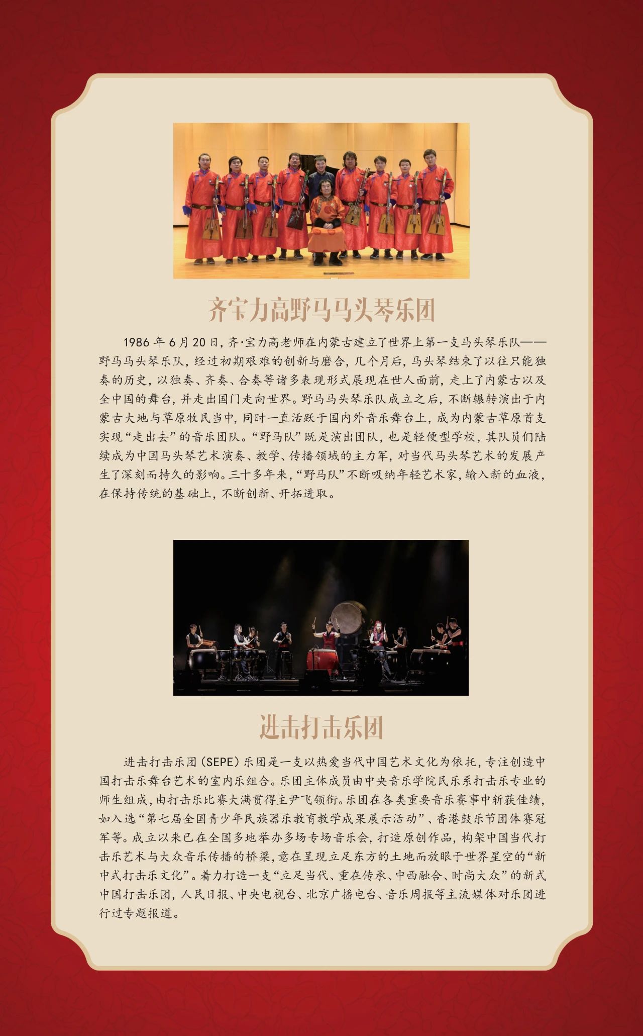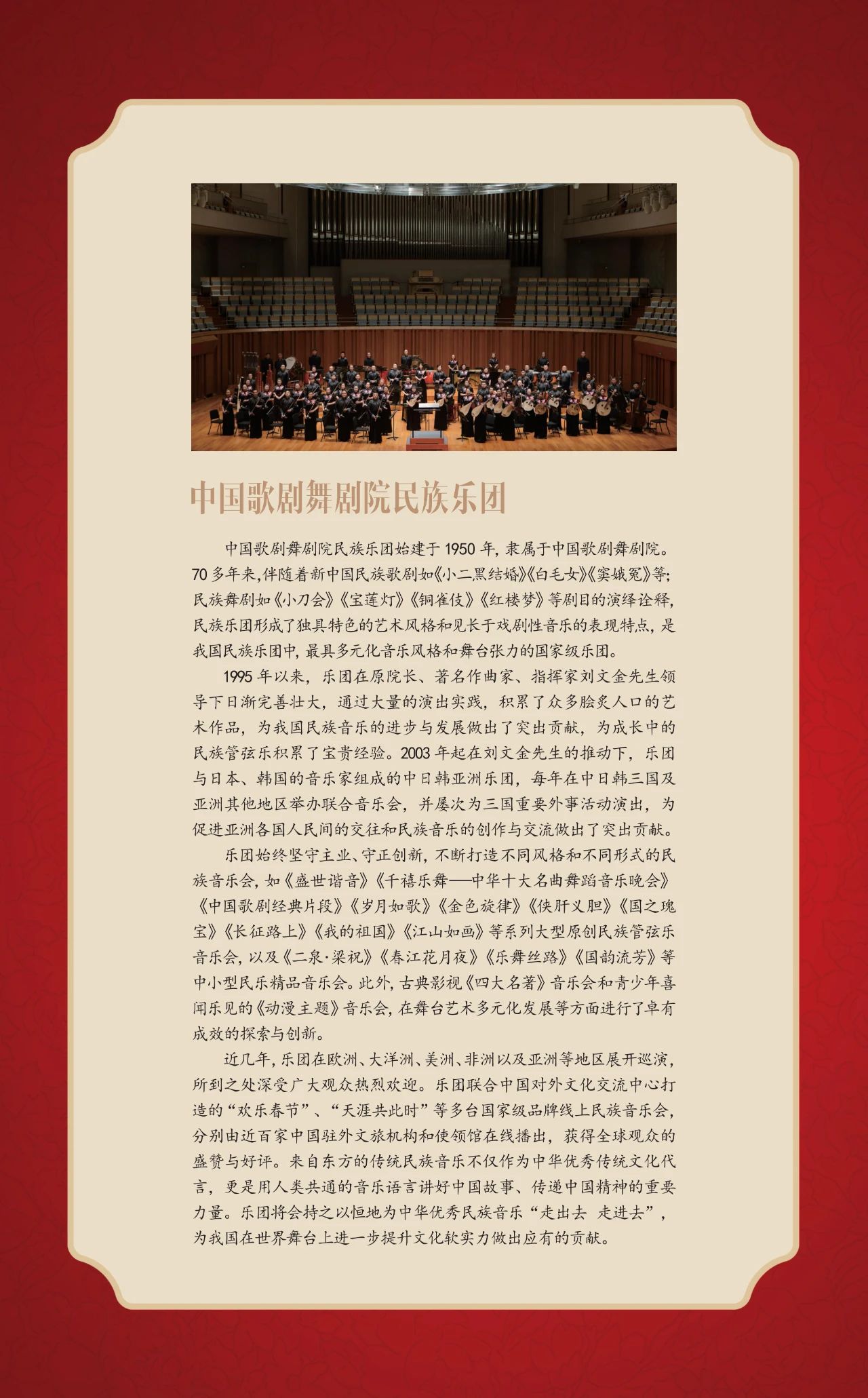 “国韵悠长——中国民族管弦乐新年音乐会”将于12月23日在国家大剧院音乐厅隆重上演。此次民乐界的盛典汇集了中国歌剧舞剧院民族乐团、中国广播民族乐团、天津歌舞剧院民族乐团、河北民族乐团4支京津冀三地的优秀音乐团体,由中国歌剧舞剧院民族乐团二胡演奏家林感担任联合乐团首席。独奏演员阵容星光璀璨,由著名指挥家张列执棒,携手古琴演奏家龚一、马头琴演奏家齐·宝力高、二胡演奏家于红梅、阮咸演奏家冯满天、唢呐演奏家牛建党、青年打击乐演奏家尹飞共同上演。音乐会特邀中央电视台著名主持人陈铎担任嘉宾主持。