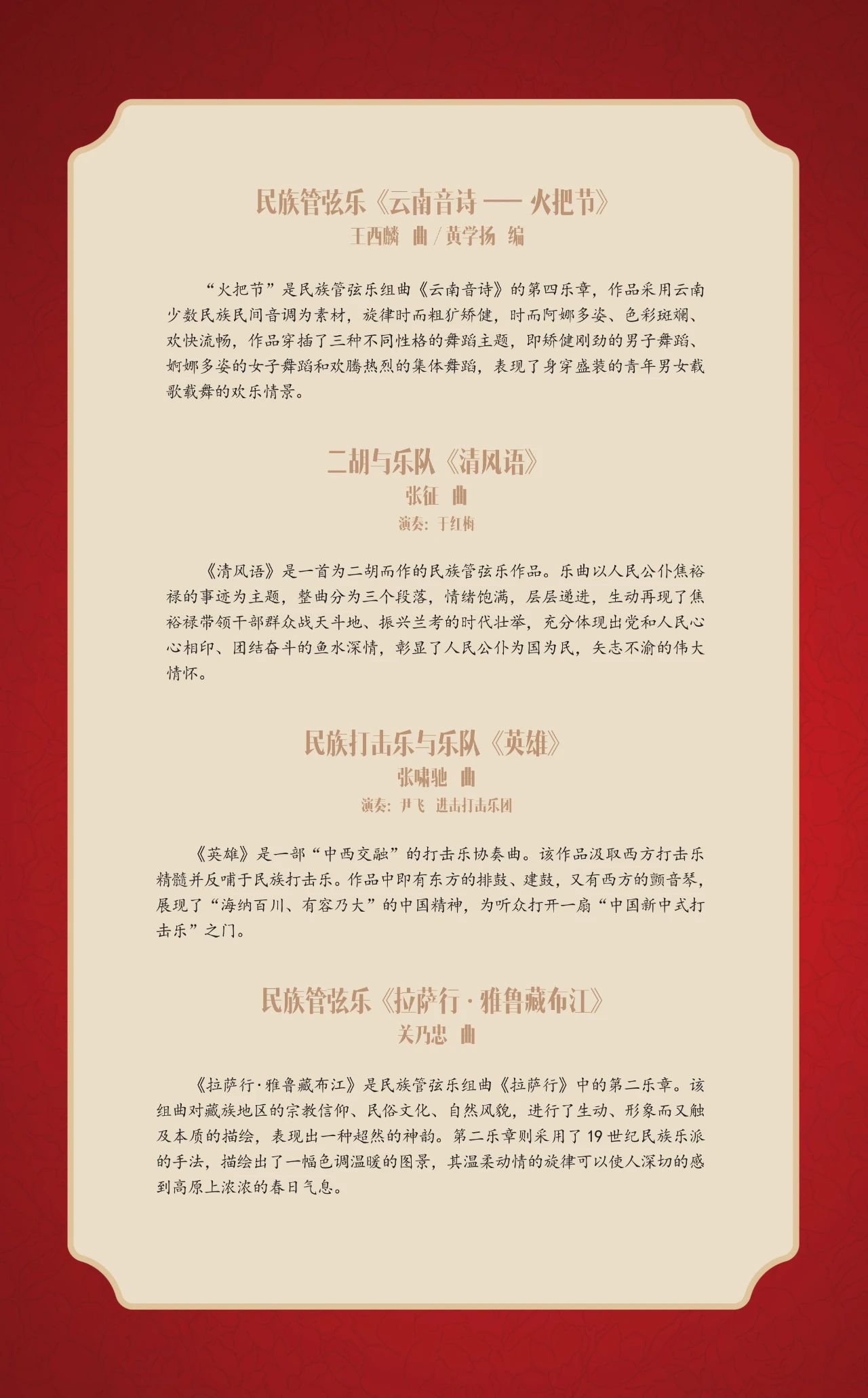 音乐会精选了李焕之、赵季平、关乃忠、王西麟等资深作曲家笔下脍炙人口的佳作,是国人置身于各类仪式场域下独有的文化记忆。同时,也有张征、姜莹、熊欣、李博禅、张啸驰等“少壮派”作曲家身处当下所感发的“新声”,勇立潮头,引吭高歌。