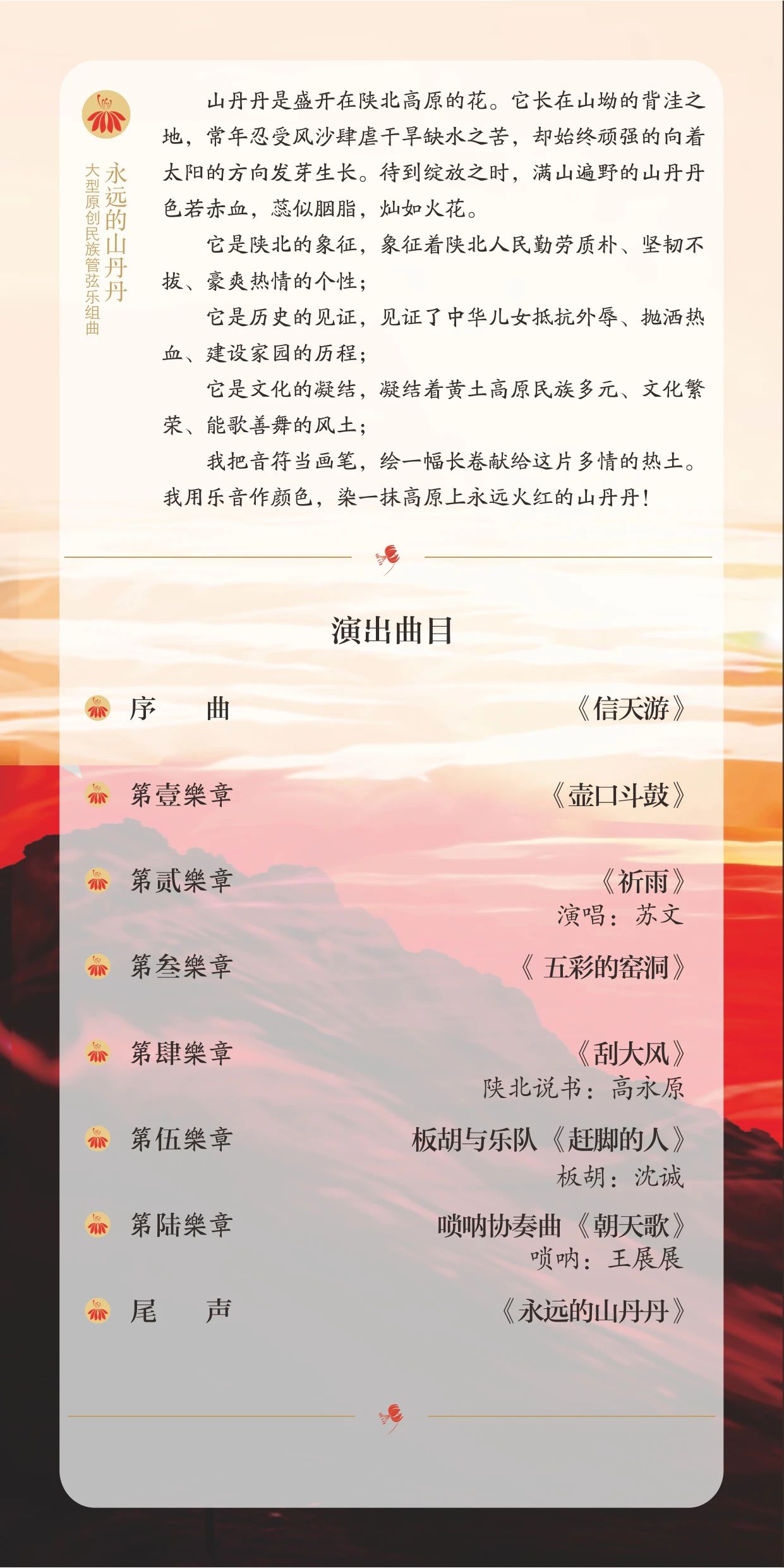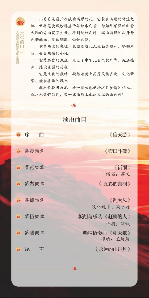 2024年1月4日,由陕西民族乐团和陕西省广播电视民族乐团联合西安市安居建设管理集团有限公司主办的“安居企业文化周——大型民族管弦乐组曲《永远的山丹丹》”音乐会将在开元大剧院举行。