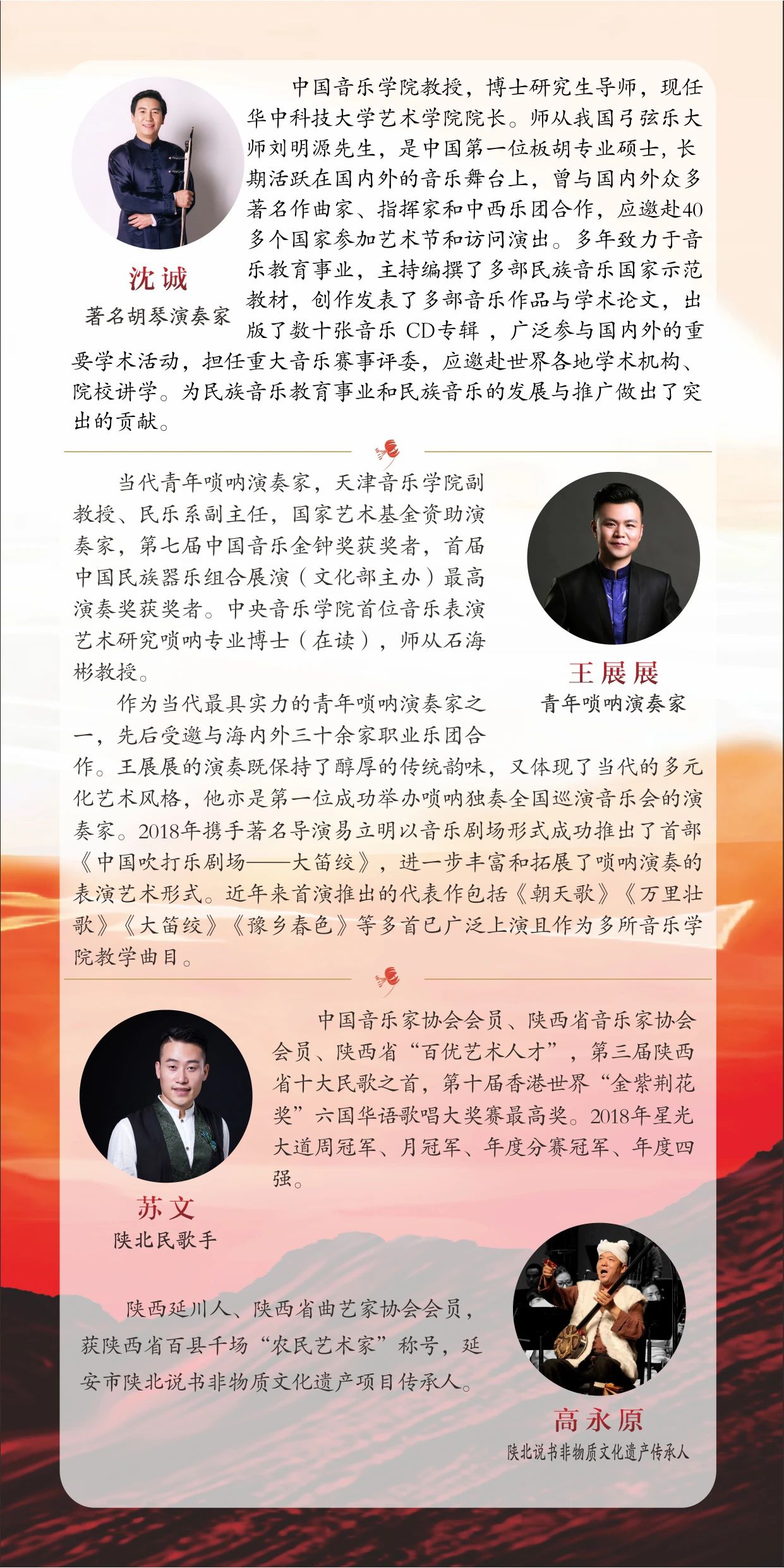 城市因人而生动,更因它的建设者们而多彩。此次音乐会特邀公安、消防、环卫、城管、医生、教师等城市建设者的代表们,与我们一起倾听山丹丹开花的声音,共同感受波澜壮阔的“陕北史诗”,体味自强不息的时代精神!