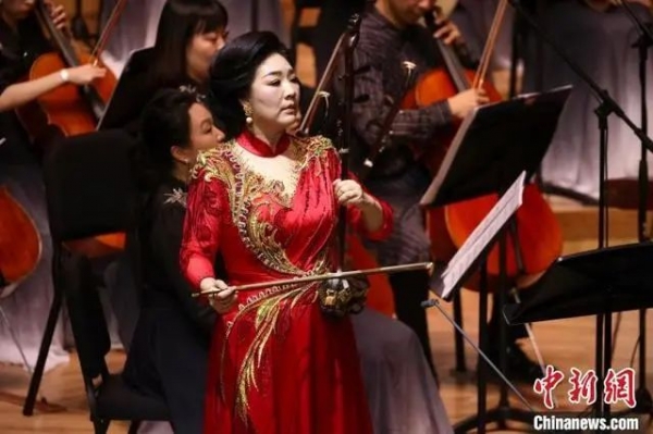 接着乐团献上了一首极具民族风格的管弦乐作品《瑶族舞曲》,该作品融合了西方作曲技法,蕴藏着中西方管弦乐的交融、影响与变化,呈现了瑶族人民载歌载舞庆祝节日的欢乐场面。紧接着一曲《阳光照耀着塔什库尔干》将观众思绪引向广袤辽阔的新疆大地,二胡演奏家宋飞的演奏在抒情段落细腻悠扬,在快板段落又极富感染力,生动地将少数民族的草原风情勾勒出来。