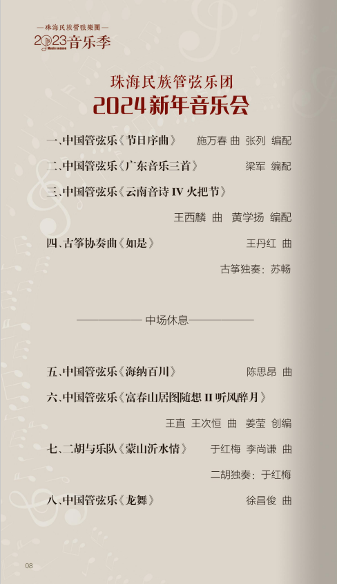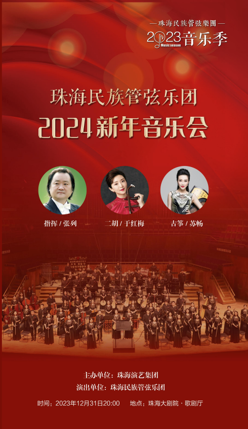 珠海民族管弦乐团2023音乐季闭幕演出——珠海民族管弦乐团2024新年音乐会。本场音乐会由珠海民族管弦乐团倾力打造,同时还特别邀请到了著名指挥家张列先生执棒,著名二胡演奏家于红梅、古筝演奏家苏畅加盟演出。
