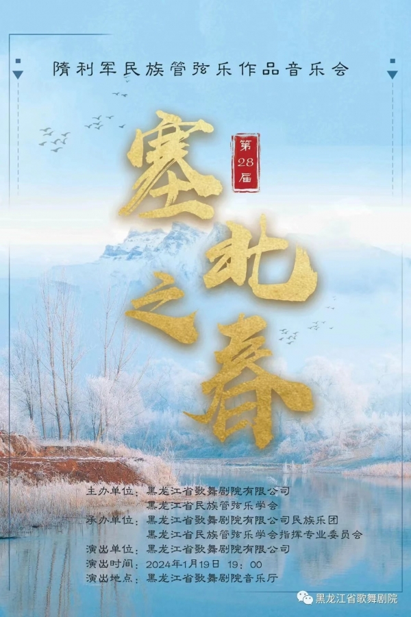 四季轮转,万象更新。2024年1月19日晚,由黑龙江省歌舞剧院有限公司、黑龙江省民族管弦乐学会主办,黑龙江省歌舞剧院有限公司民族乐团、黑龙江省民族管弦乐学会指挥专业委员会协办的“第28届——“塞北之春”隋利军民族管弦乐作品音乐会在黑龙江省歌舞剧院有限公司音乐厅隆重举行。中国民族管弦乐学会会长、中国艺术研究院博士生导师吴玉霞、中国民族管弦乐学会党支部书记、中国广播艺术团原党委书记、团长王书伟,中国民族管弦乐学会副秘书长宋阳及俄罗斯阿穆尔州文化与民族政策部部长多尔古诺娃及其团队以及来自省内外民族音乐专家、学者现场聆听本场音乐会。此次民族管弦乐作品音乐会为听众奉上黑土豪情的音乐盛宴。