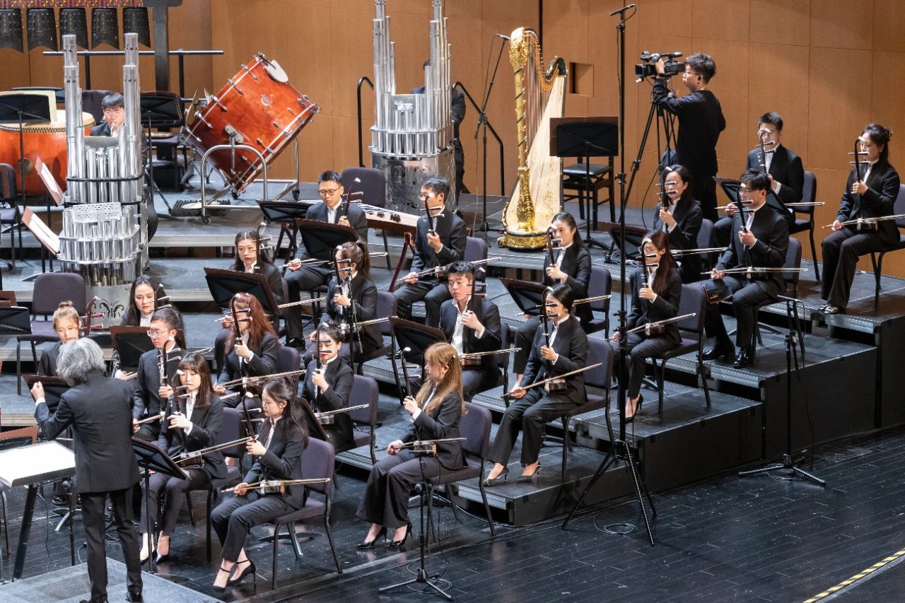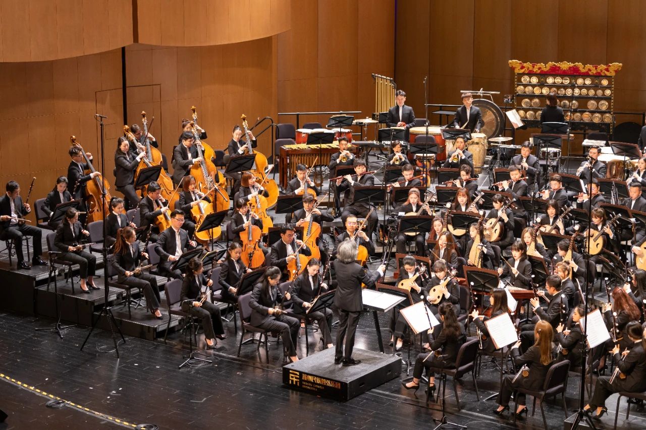音乐会下半场,中国管弦乐《我的祖国》以磅礴的气势,抒发出了强烈的民族自豪感和爱国情怀;二胡演奏家杨雪与琵琶演奏家曹杨携手呈现的《火·彩衣姑娘》则带领听众进入了一个充满光亮、温暖与热情的“火”之世界;随后,《戏彩》的旋律响起,京胡演奏家王彩云、女高音郭霄和月琴演奏家宋艾雯共同演绎了这首兼具抒情与戏剧性的经典之作,京剧的唱腔、调式巧妙地融入奏鸣曲式结构中,为听众呈现了一幅充满东方神韵的音乐画卷。