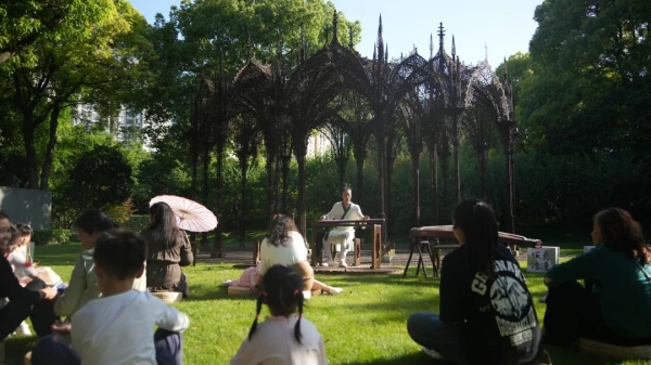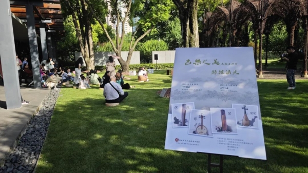 当公园与城市无界融合,当中华传统乐器在蓝天绿草间演奏出悠扬的音符……5月18日,“古乐之美”系列音乐会——“丝弦清波”在静安雕塑公园梅园星光亭举办,古琴、古筝、琵琶、中阮等传统弦乐如清波荡漾的音符,吸引了不少中外游客驻足欣赏,流连忘返。