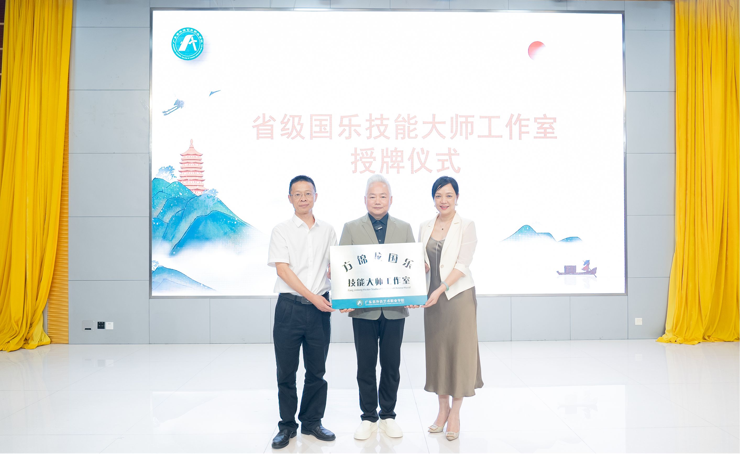 国乐艺术家方锦龙与广东省外语艺术职业学院音乐舞蹈学院表演艺术专业共同精心打造了原创情景器乐剧,并携手共创了“乐舞诗画”这一品牌项目,为搭建实践教学基地和产教融合平台做出了显著贡献。在欢快的音乐声中举行了授牌仪式,黄泽瑜副书记与音乐舞蹈学院陈路芳院长共同向省级国乐技能大师工作室进行了授牌。