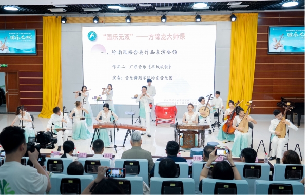 2024年5月22日-23日,伴随着“技艺传承,国乐无双”这一激动人心的口号,广东省外语艺术职业学院省级技能大师工作室“产学研演”系列活动拉开了帷幕。22日,省级技能大师工作室团队在主持人方锦龙老师的带领下与音乐舞蹈学院联手打造了一场别开生面的“国乐无双”方锦龙大师课和“五弦琵琶游世界”专题讲座。广东广播电视台大湾区卫视和国家轻工业乐器信息中心《乐器》杂志记者,用镜头记录下这一精彩瞬间,对大师工作室在国乐表演人才培养方面取得的成就进行了深入的专题采访。