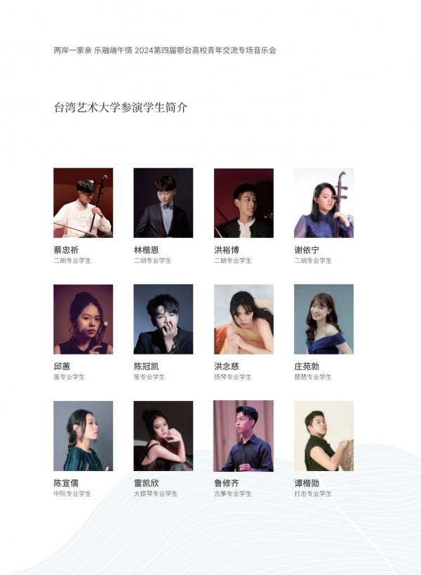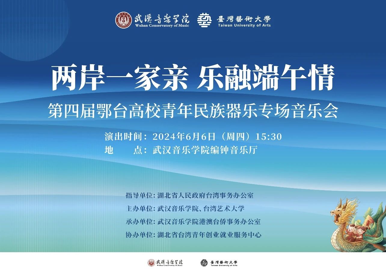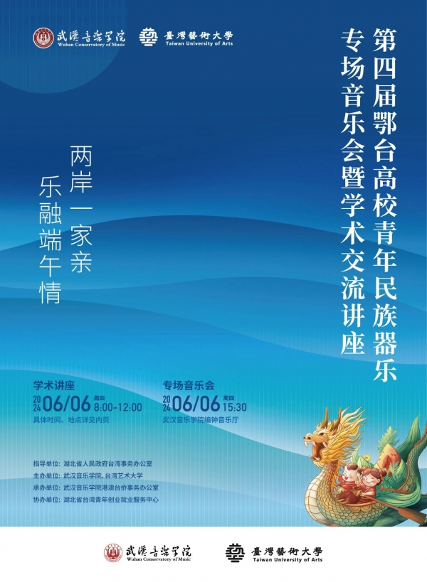 由湖北省人民政府台湾事务办公室指导,武汉音乐学院、台湾艺术大学联合主办的“两岸一家亲 乐融端午情”鄂台高校青年民族器乐专场音乐会,将于6月6日在武汉音乐学院举行。