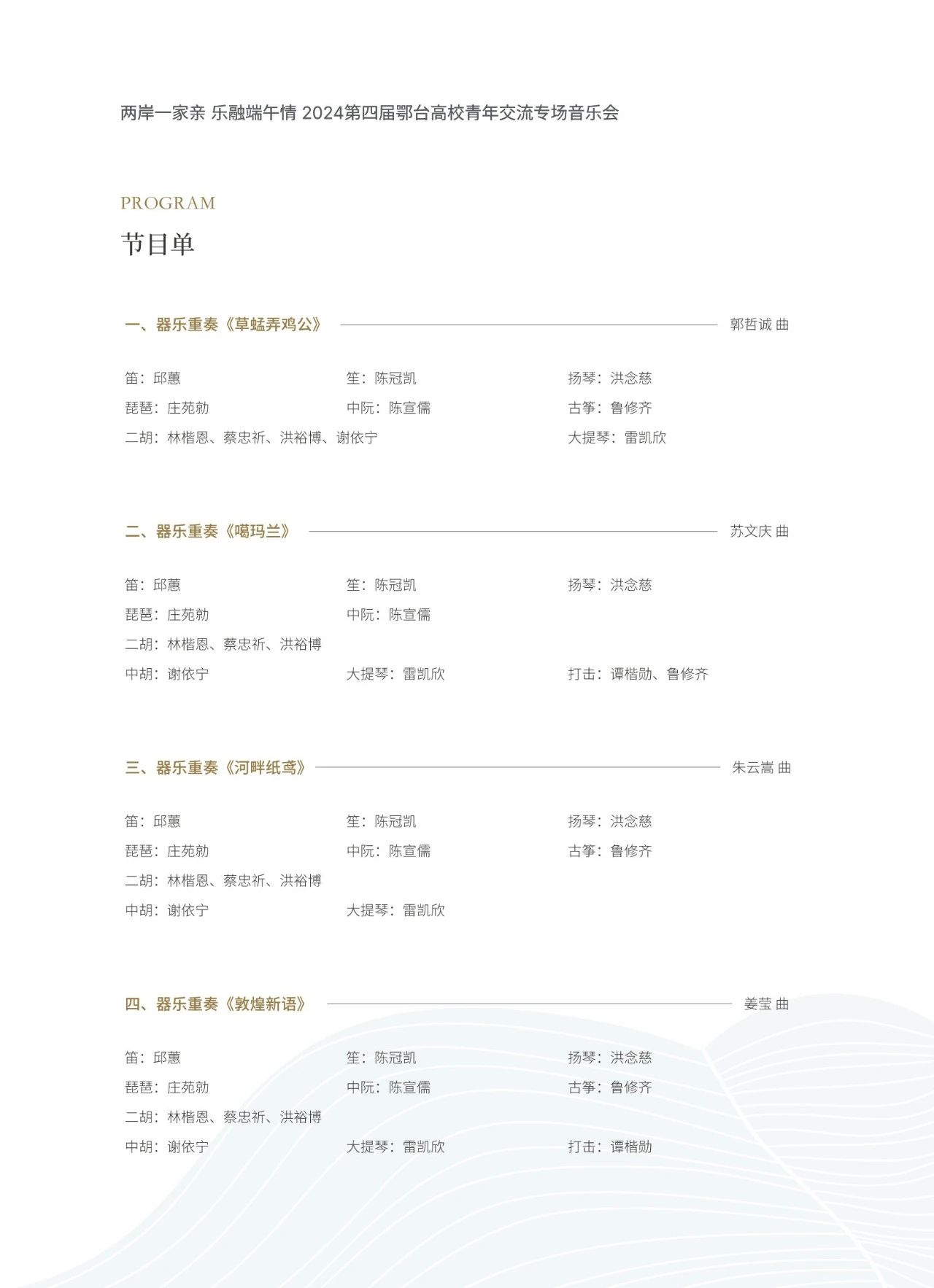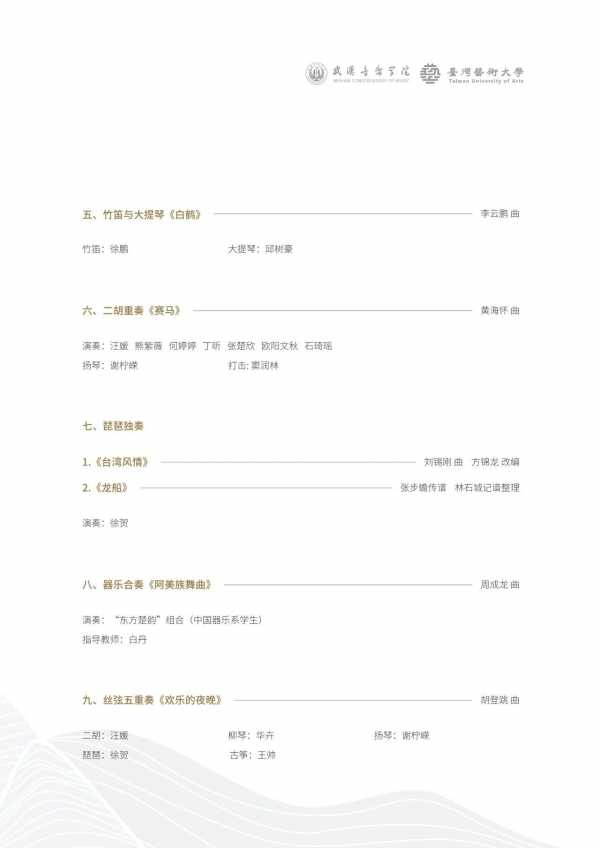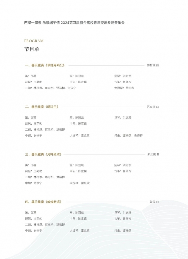 民族器乐专场音乐会涵盖多种表演形式,有独奏、合奏、重奏等。节目包括台湾艺术大学师生丝竹乐团演奏的室内乐《草蜢弄鸡公》《噶玛兰》《河畔纸鸢》,以及运用民族乐器的特性,展现“古道驿站”、“敦煌盛世”繁盛景象的乐曲《敦煌新语》。武汉音乐学院教师带来竹笛与大提琴《白鹤》、琵琶独奏《台湾风情》、民族室内乐《阿美族舞曲》、二胡重奏《赛马》、丝弦五重奏《欢乐的夜晚》,以及描写中华传统节日——端午节划龙舟热烈场面的琵琶独奏曲《龙船》。