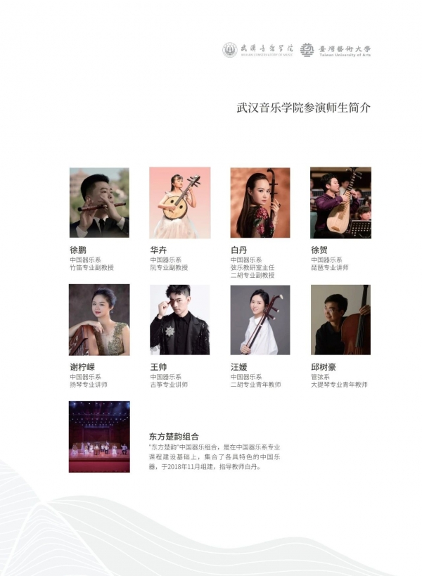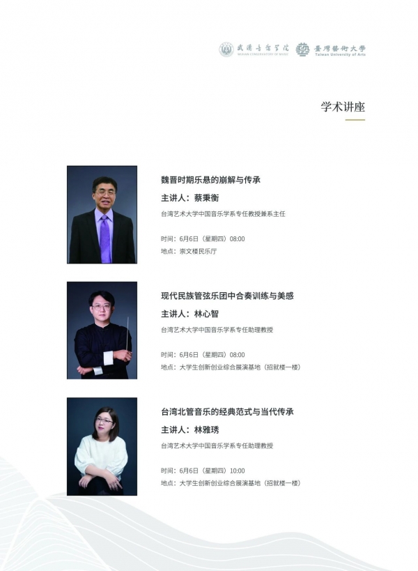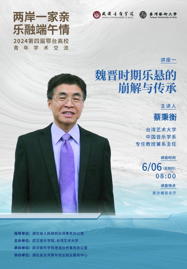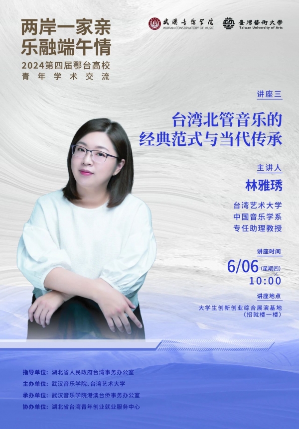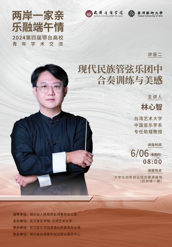 据了解,本次活动由湖北省台湾青年就业创业服务中心协办,武汉音乐学院港澳台侨事务办公室承办。音乐会期间,台湾艺术大学蔡秉衡教授、林心智助理教授、林雅琇助理教授分别作三场学术交流讲座。