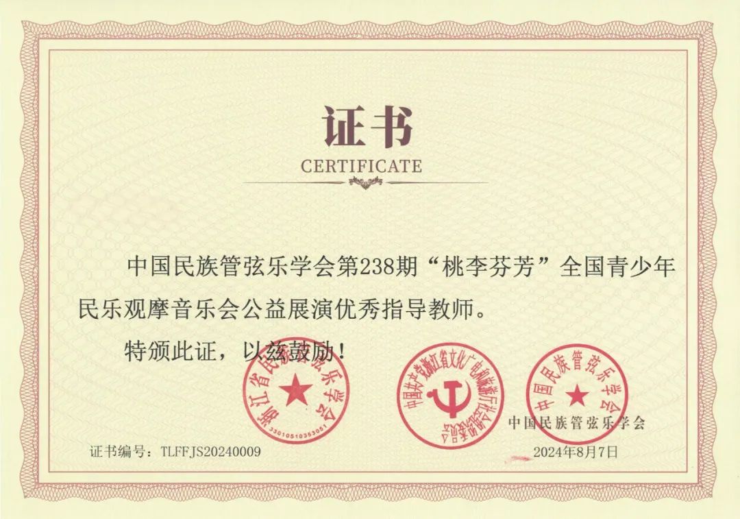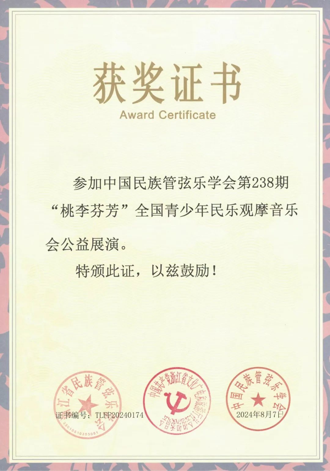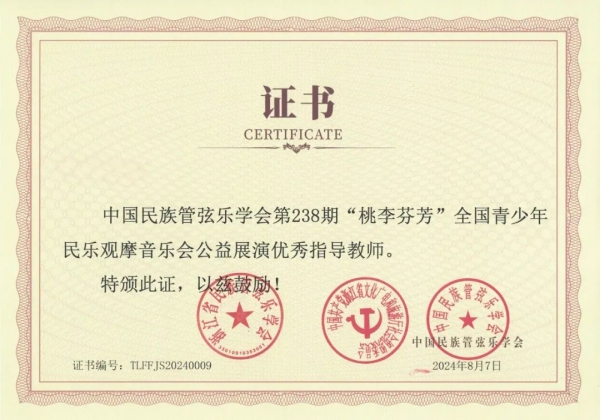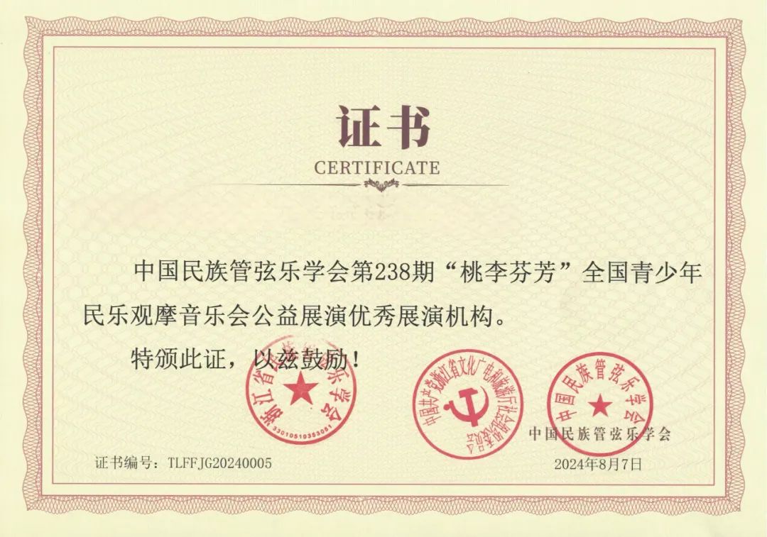 “桃李芬芳”全国青少年观摩音乐会以为学习民族音乐的青少年提供一个艺术实践平台为宗旨,以进一步推动全社会民乐考级工作的开展,促进中国民族音乐艺术的发展为目标。浙江省文化广电和旅游厅社会组织委员会和浙江省民族管弦乐学会作为主办方,在活动开展中展现出了强大的社会责任感和工作组织能力。在多方的努力下,音乐会汇聚了来自杭州、宁波、温州、绍兴、金华、台州等浙江省各地以民乐见长的小学以及培训机构。同时,本次音乐会为每位参演人员、指导教师和优秀展演机构分别制作了“个人展演获奖证书”、“优秀指导教师证书”和“优秀展演机构证书”,为学校美育和社会美育在关键的“实践”、“评价“环节提供了难能可贵的展示交流平台。